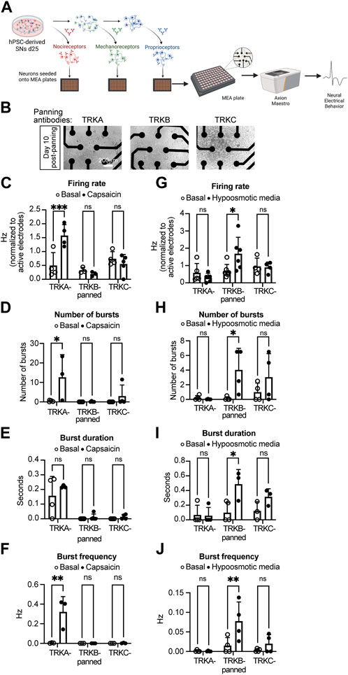 FIGURE 4. Electrical activity of immunopanned SNs. (A) Schematics of the experiment workflow. (B) Representative brightfield images of panned SNs seeded in MEA plates (with visible electrodes) 10 days after panning. (C–F) Action potential firing rate (C), number of bursts (D), burst duration (E), and burst frequency (F) of SNs panned with the indicated antibodies and treated with capsaicin (nociceptor activator). (G,H) Action potential firing rate (G), number of bursts (H), burst duration (I), and burst frequency (J) of SNs panned with the indicated antibodies and treated with hypoosmotic media (mechanoreceptor activator). n = 3–6 biological replicates. Graphs show mean ± S.D. two-way ANOVA was used. ns, non-significant, ∗p < 0.05, ∗∗p < 0.01, ∗∗∗p < 0.001.