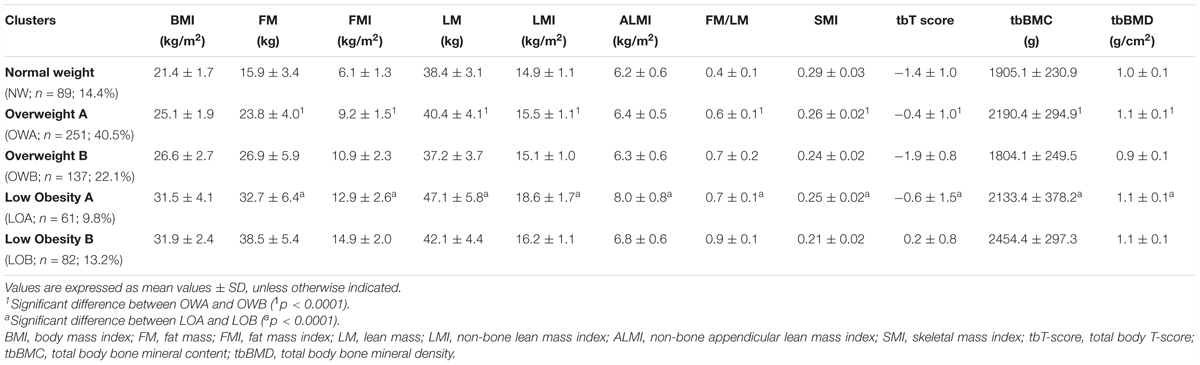 TABLE 3A. Body composition and BMI characteristics of the five groups identified by cluster analysis in women (N = 620).