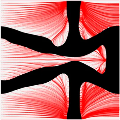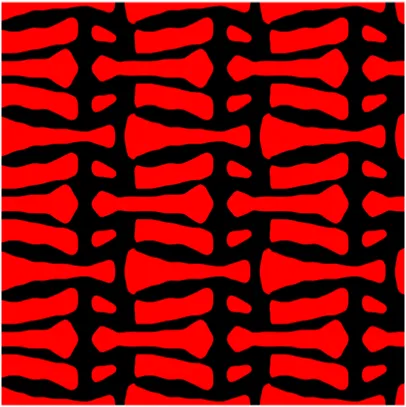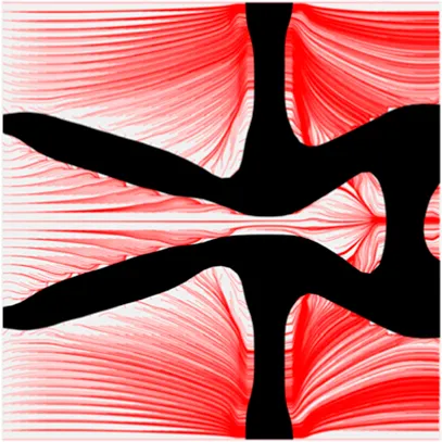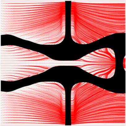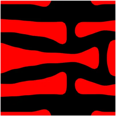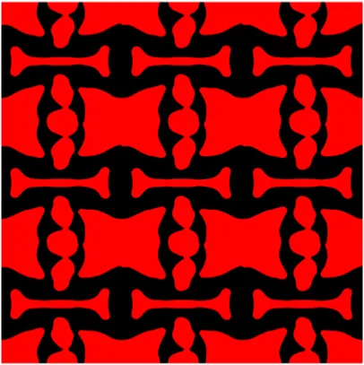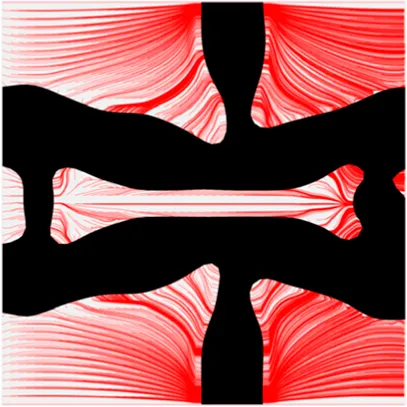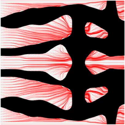 The volume fraction of the microstructure in the optimization is another factor in determining the optimization results. It should not be too big to block blood flow, or too small to support the artery. Thus, the volume fractions from 25 to 60% are used to investigate the optimization results. The optimized results are summarized in Table 1, which includes the microstructure of each case, the related 3 × 3 microstructural array, and the blood flow streamlines in the design domain. In the table, the black colour denotes stenting microstructures, and the red colour shows blood.