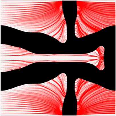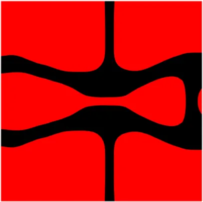 The MFP related to the design variables can be calculated by:where the velocity vector w2D is extracted from the velocity vector , which is calculated by the following momentum equation performed in the 3D computational domain.where and are the boundary conditions defined in the CFD model, given bywhere Hf denotes the Heaviside function H applied to the Darcy-Stokes coupling in the CFD model. Θ in Hf is equal to zero to identify fluid material in the design domain. The used for the evaluation of the mechanical properties in the optimization model can be calculated by:where Dpqrs is the elasticity tensor of the solid. is the test unit strain field, where (1,0,0)T, (0,1,0)T and (0,0,1)T are used. is the strain field related to the displacement u2D that can be calculated bywhere w is the virtual displacement field.