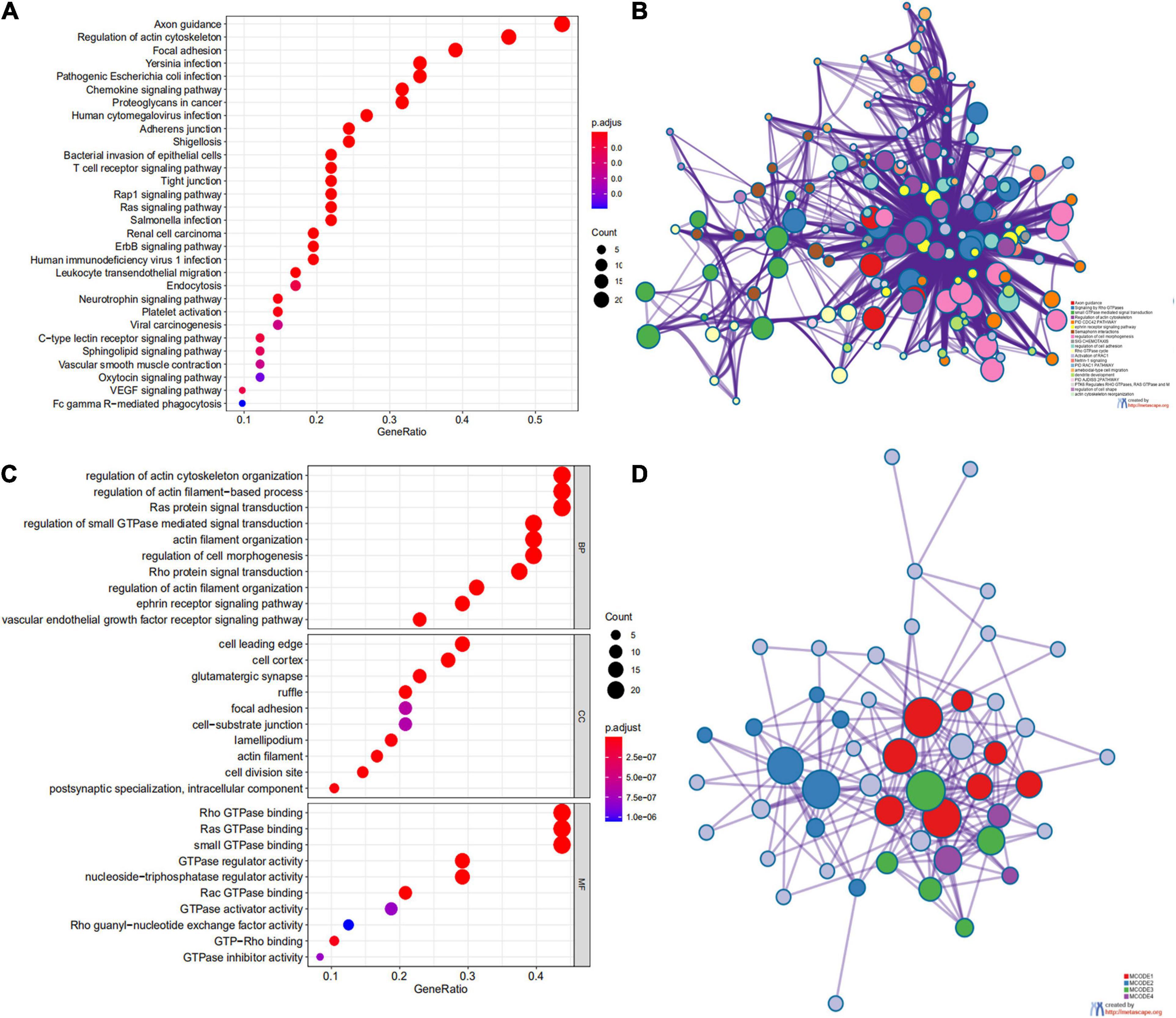 Figure 3. Network and potent construction analysis of 50 ARHGAP family neighboring genes in BCa. (A) KEGG pathway analysis of 50 most neighboring correlated genes, p < 0.05. (B) GO analysis of 50 most neighboring correlated genes, p < 0.05. (C) Nodes contain differential genes, which are typically close to each other are displayed with the same color. Terms with a similarity > 0.3 are connected by edges. (D) Protein–protein interaction network and Molecular Complex Detection (MCODE) components identified of the hub correlating genes.