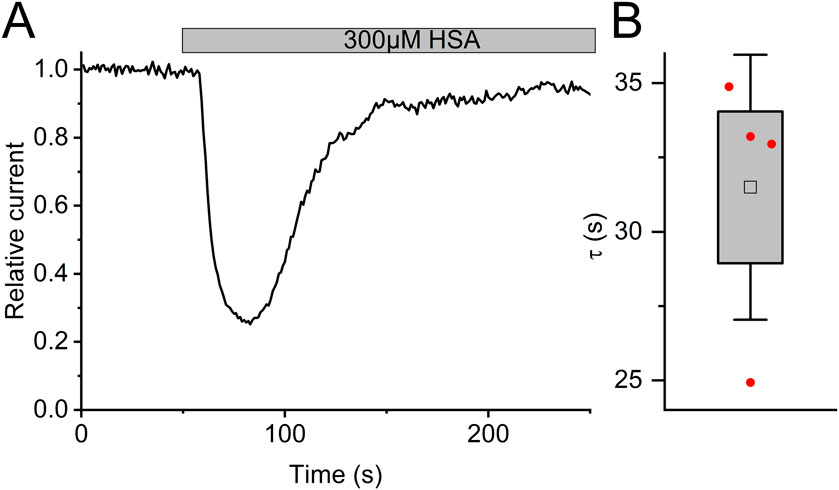 Figure 7. The action of albumin on Slo3 channels is transient (A) Time course of the inhibition of Slo3 channels recorded from CHO cells after perfusion with albumin. (B) Time constant of the relieve of inhibition in the presence of albumin.
