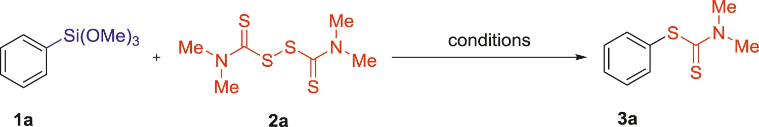 To further evaluate the applicability of this reaction, the reactivity of trimethoxy (phenyl)silane (1a) was investigated using tetramethylthiuram monosulfide (TMTM, 5) as the coupling partner (Wu et al., 2020). As expected, the cross-coupling reaction occurred smoothly, and the phenyl dimethylcarbamodithioate 3a was formed in 46% yield (Scheme 2).