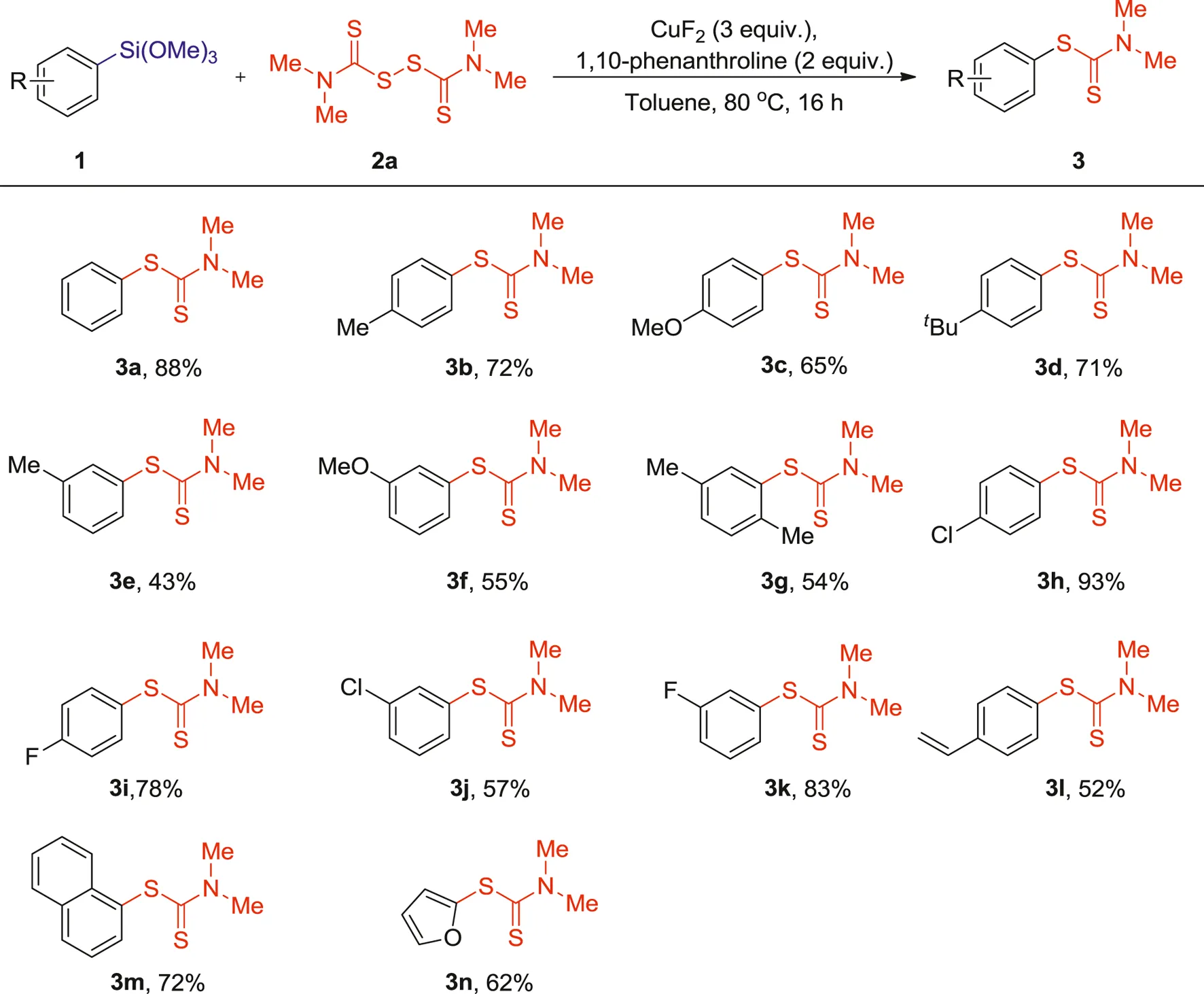 Having the optimized conditions in hand, we then proceeded to explore the scope of the reaction with respect to both the organosilane reagents and the thiuram disulfides (Table 2 and Table 3). Generally, phenylsilanes bearing diverse substituents such as methyl, methoxyl, tert-butyl, chloro and fluoro groups offered the desired products in moderate to good yields. Notably, this reaction tolerated the electron-rich arylsilanes (Table 2, 3b-g), as (4-methylphenyl) trimethoxylsilane, (4-methoxyphenyl) trimethoxylsilane and (4-(tert-butyl)phenyl) trimethoxylsilane coupled efficiently with tetramethylthiuram disulfide 2a to give 3b-d in 65–72% yields. When methyl, methoxyl, were introduced into the meta position of phenylsiloxanes, slight lower yields were obtained (3e-g, 43–55%), which may be caused by steric hindrance effect. Excellent yields were got for electron-deficient arylsilanes such as (4-chlorophenyl)trimethoxysilane and (4-fluorophenyl) trimethoxysilane. Compared with electron-rich substituents, arylsilanes with electron-withdrawing groups on the aromatic ring presented relatively higher reactivity (3b-c vs 3h-i, 65–72% vs 78–93%). This result makes the said cross-coupling reaction particularly attractive for further transformation by transition-metal-catalyzed coupling reactions. Pleasingly, these reaction conditions were also compatible with trimethoxy (4-vinylphenyl)silane, 1-(trimethoxysilyl)naphthalene and 2-furan-trimethoxysilane, which provided the corresponding products 3l-n in 52–72 yields.