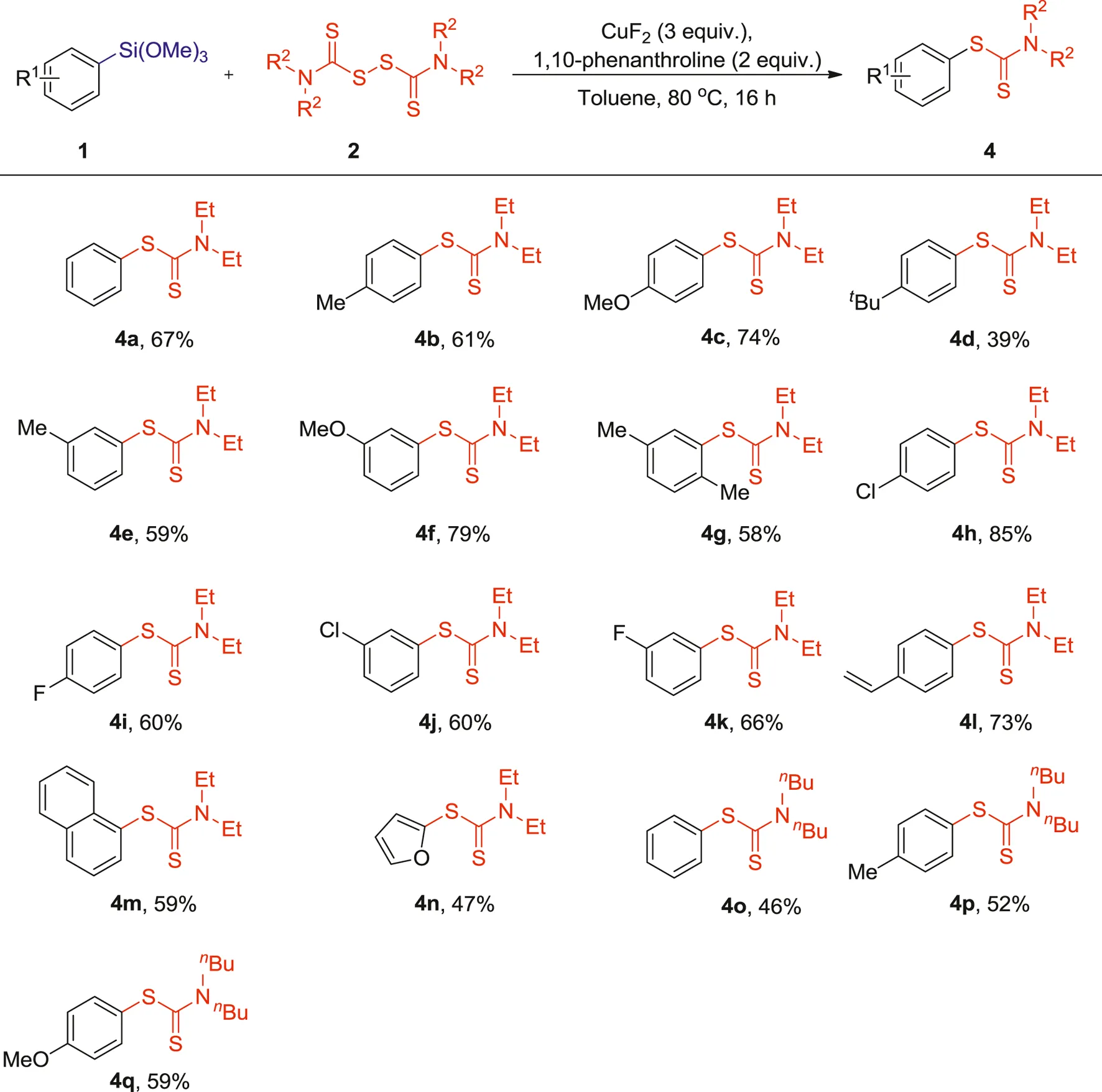 This cross-coupling reaction also demonstrated a good tolerance toward other N,N,N′,N′-tetraalkylthiuram disulfides as shown in Table 2. The N,N,N′,N′-tetraethylthiuram disulfide (TETD, 2b) showed a good reactivity and furnished the corresponding S-aryl dithiocarbamates products in moderate to good yields (4a-n, 39–85%). Comparatively, the reaction of N,N,N′,N′-tetrabutylthiuram (TBTD, 2c) and arylsilanes showed relatively lower reactivity, and afforded lower yields of the corresponding products (4o-q, 46–59%). It is worth noting that the yields of the resulting products were modulated by the presence of different alkyl substituents on the tetraalkylthiuram disulfides. Slightly lower yields were obtained when longer chain-substituted tetraalkylthiuram disulfides were used in these reactions (3a vs 4a and 4°).