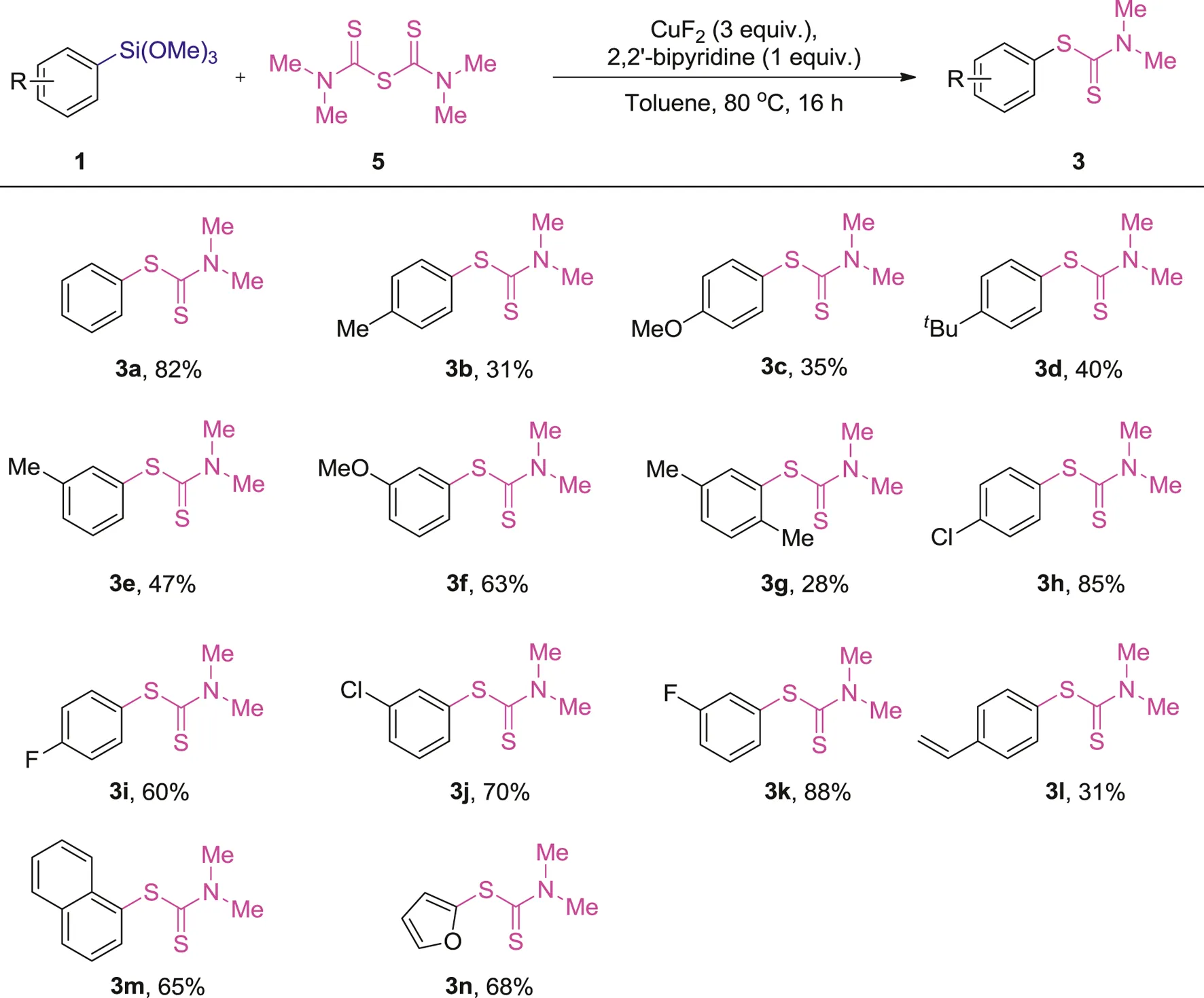 In general, the results obtained from the cross-coupling reaction of arylsilanes 1) with tetramethylthiuram monosulfide (TMTM, 5) are different from the reaction with tetramethylthiuram disulfide (TMTD, 2a), in which the electron-rich arylsilanes are less active (3b-g, 28–63%). With regard to the electron-deficient arylsilanes, they showed a similar efficiency as the reaction with tetramethylthiuram disulfide (TMTD, 2a), and the products (3h-k) were provided in 60–88% yields. The 1-(trimethoxysilyl)naphthalene and 2-furan-trimethoxysilane also participated in this reaction to give the corresponding products (3m-n) in 65–68% yields, which are nearly the same results compared with the reaction with TMTD (2a). In contrast, the trimethoxy (4-vinylphenyl)silane exhibited a less activity in this reaction and displayed lower yield (3l, 31%).
