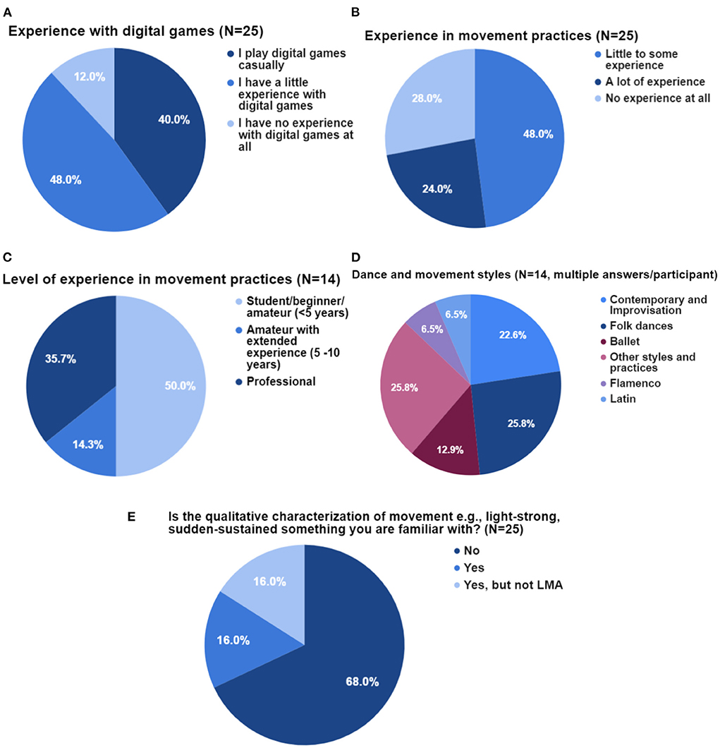 Figure 8. Participants' background. Panel (A) shows their experience with digital games, (B) experience with movement practices, (C) level of experience in movement practices, (D) dance and movement styles they are familiar with and (E) the level of familiarity with movement characterization.