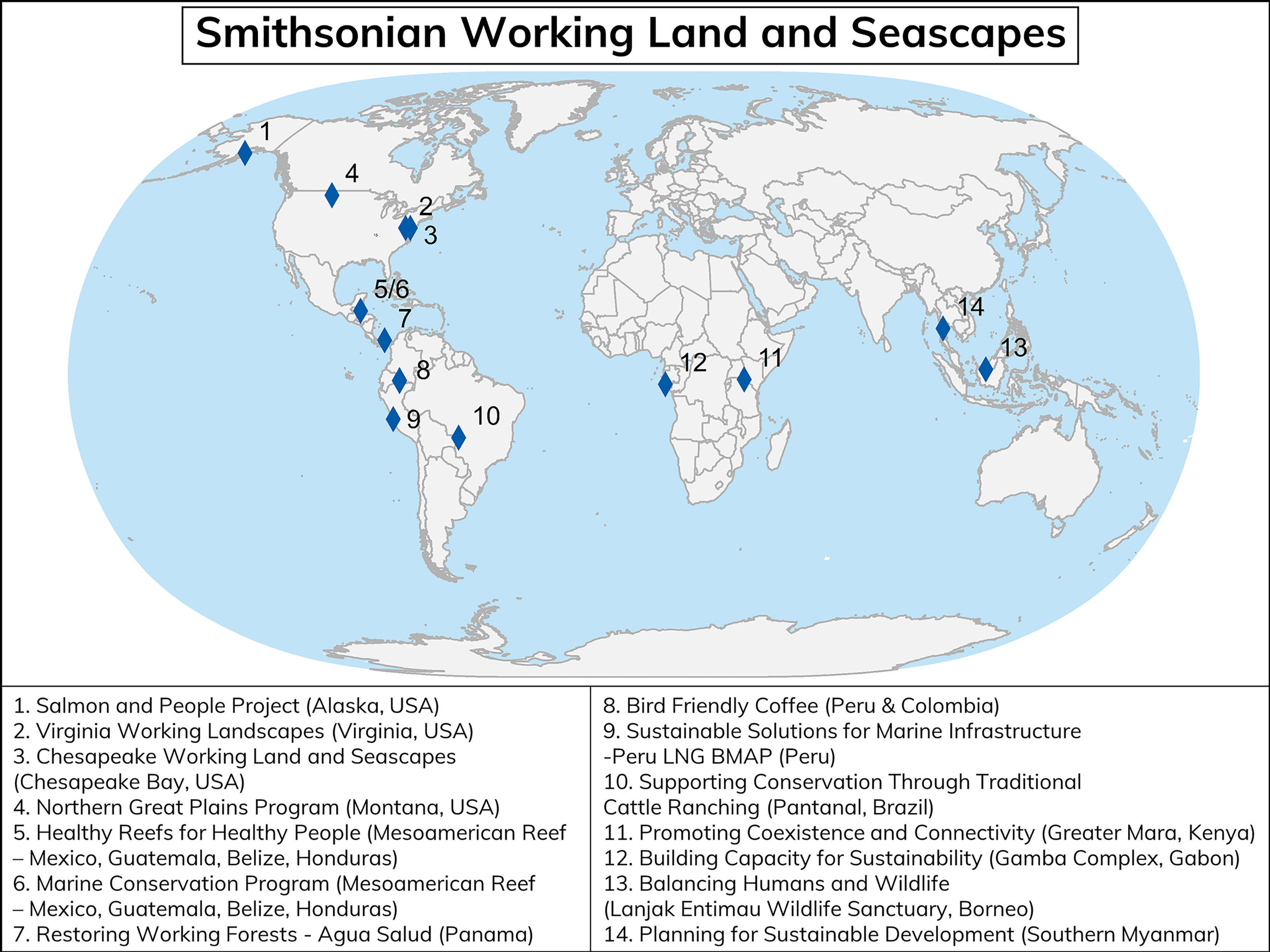 Figure 2 Map of locations of Smithsonian Institution’s Working Land and Seascape Initiative projects (Credit: Craig Fergus).