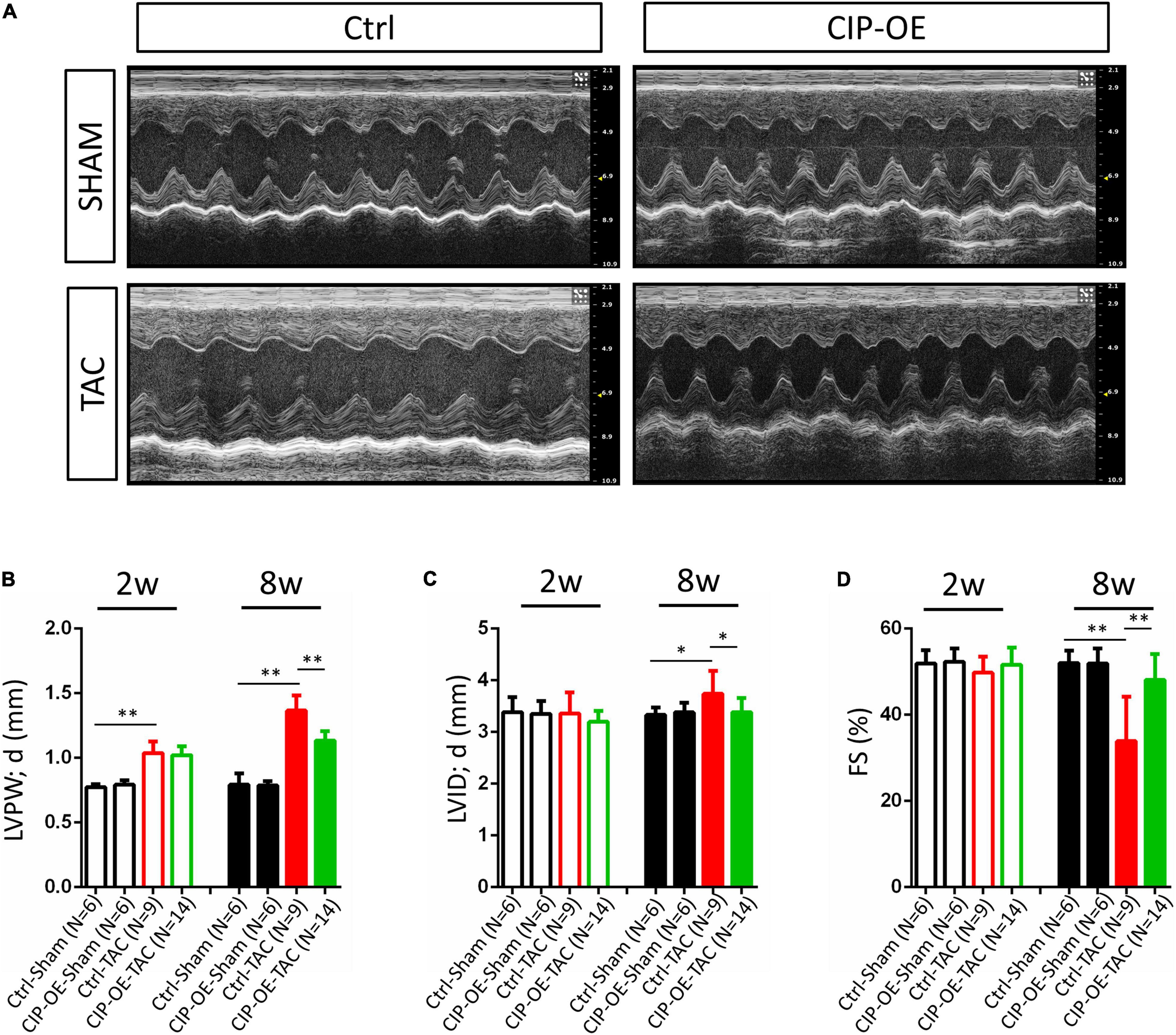 Figure 3. Cardiac-overexpression of CIP preserves cardiac function during the disease progression toward heart failure. (A) Representative echocardiographic images from indicated group at 8 weeks after operation. (B) Left ventricular posterior wall thickness at end-diastole (LVPW;d), (C) Left ventricular internal dimension at end-diastole (LVID;d) and (D) Fractional shortening (FS) of CIP-OE mice and their control littermates with TAC or Sham operation determined by echocardiography at 2 weeks (2w) and 8 weeks (8w) after operation. N number for each group is show. The significance between groups was tested with 1-way ANOVA with post hoc Tukey’s test. *P < 0.05; **P < 0.01.