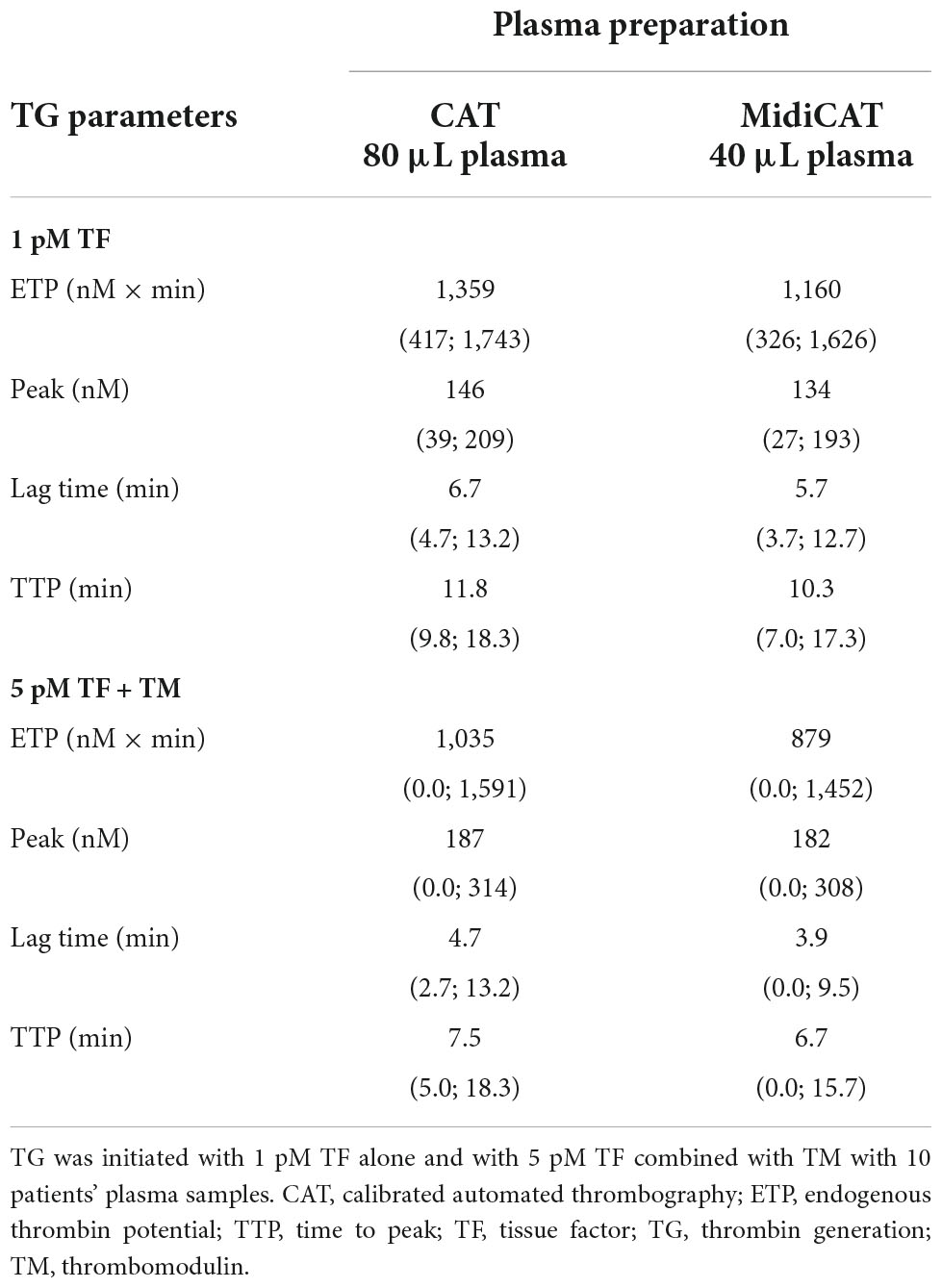 Whether the volume of plasma required for TG studies can be reduced is a significant issue of practical importance. We have provided the first external validation of the MidiCAT procedure and conclude that accurate measurement of TG curves is feasible with half of the volume of the reference CAT method. The second issue we addressed was the simplified but still acceptable pre-analysis conditions. With this study, we aim to raise awareness of the lack of impact of artifactual contact activation or residual platelets on TG when using reagents containing 5 pM TF. We believe that our results add sufficient data to the previous study to allow for the use of the MidiCAT method with 5 pM TF with TM or with 1 pM TF (now referred to as, respectively, intermediary and low picomolar concentrations of TF). Moreover, the use of single-centrifuged plasma samples from biobanks for MidiCAT with 5 pM TF seems acceptable, provided no TM is added. A double-centrifugation scheme is recommended otherwise.