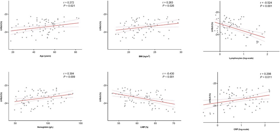 Among all AL patients, LVGLS was correlated with LVEF (r = −0.430, P < 0.001), BMI (r = 0.263, P = 0.026), age, (r = 0.272, P = 0.021), the absolute number of C reactive protein (CRP) (r = 0.298, P = 0.011), the absolute number of circulating lymphocytes (r = −0.524, P < 0.001) and hemoglobin counts (r = 0.304, P = 0.009; Figure 3). Therefore, a decrease in LVGLS was associated with a reduction in the absolute number of lymphocytes and LVEF and with an increase in age, BMI, the absolute number of CRP and hemoglobin counts. In a multivariable linear regression analysis, the factors independently associated with LVGLS were LVEF (β = −0.085, P = 0.019) and the absolute number of circulating lymphocytes (β = −0.814, P = 0.004). However, RVFWLS was only correlated with BMI (r = 0.323, P = 0.005) and hemoglobin counts (r = 0.267, P = 0.021) (Supplementary Table S1).