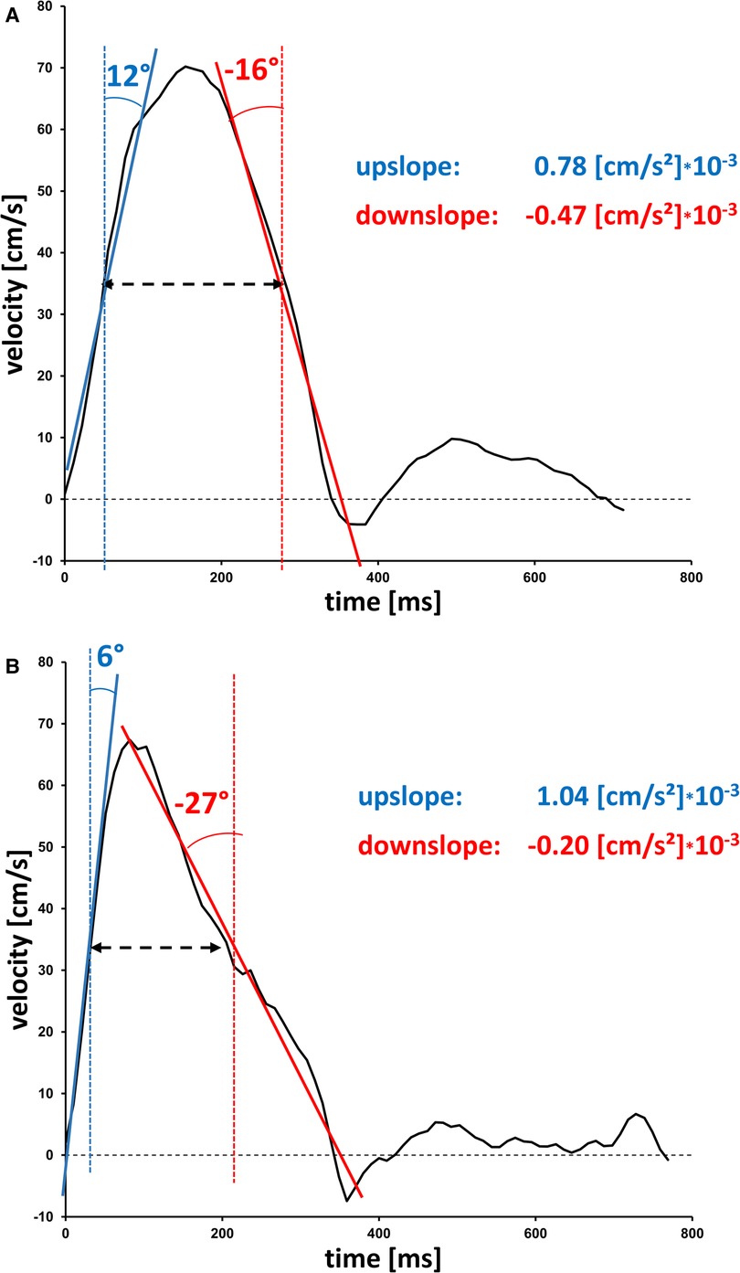 Figure 2. Age-dependent velocity-time curves. Velocity-time curves in the main pulmonary artery from (A) a young participant (female, 18 years) and (B) an older participant (female, 63 years). Typically, upslopes are larger in older subjects, whereas downslopes are smaller. Angulations are presented as a surrogate for slopes values.