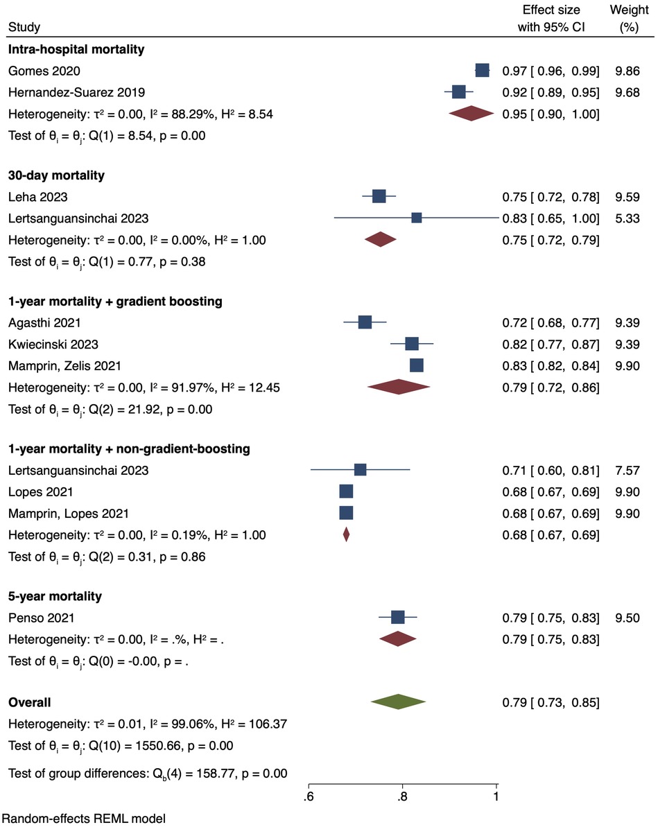 Studies that reported data comparing AI and traditional scores were analysed using Review Manager 5.3 (RevMan 5.3) software (22). Due to the limitations of RevMan 5.3 in pooling AUC values, reported means were converted to negative values and inputted into the software. We calculated the mean difference (MD) as the outcome effect measure used in our double-arm meta-analysis. For studies that reported 95% CI, the in-built RevMan calculator was used to estimate the missing standard deviations (SD). For single-arm meta-analysis, the STATA 17 software was used to pool study data and generate forest plots (23). In order to adjust for statistical heterogeneity across all study populations, all data was analysed using random effects models. All data is reported in mean and 95% CI [lower limit, upper limit]. In our subgroup analysis, we divided the studies by intra-hospital, 30-day, 1-year and 5-year mortality. For the 1-year mortality subgroup, gradient boosting and extreme gradient boosting models were grouped together as the models are similar and we had insufficient data to compare each individually. Similarly, non-gradient-boosting algorithms (random forest, decision tree, artificial neural network, multilayer perceptron) were also grouped together for subgroup analysis.