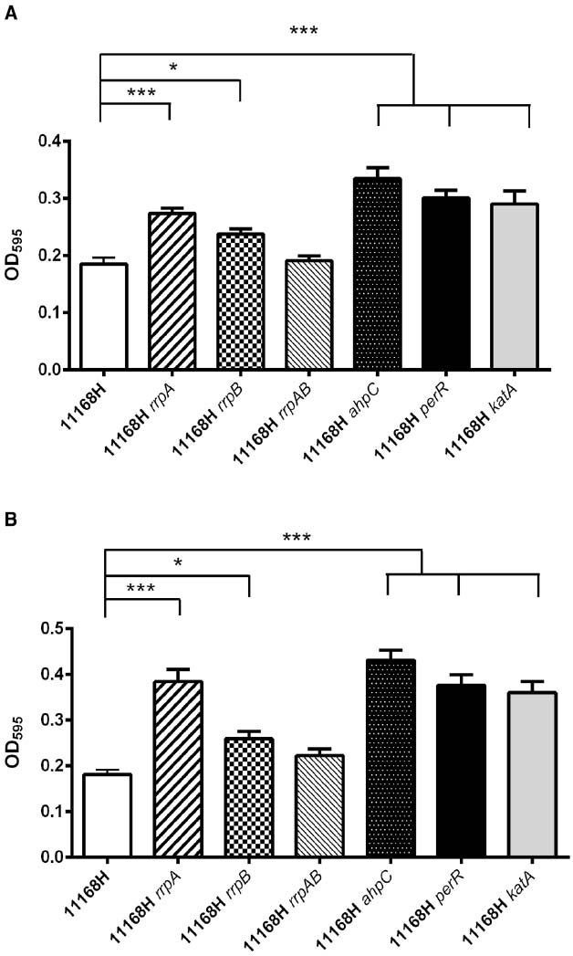 Figure 3. (A) Effect of oxidative stress on the survival of C. jejuni 11168H wild-type strain and rrpAB, katA, and perR mutants. C. jejuni strains were incubated with 25, 50, or 100 mM H2O2 for 15 min at 37°C and bacterial survival assessed. (B) Catalase activity assays were performed on bacterial whole cell lysates from the 11168H wild-type strain and rrpAB, katA and perR mutants for 1 min. Asterisks denote a statistically significant difference (***p < 0.001).