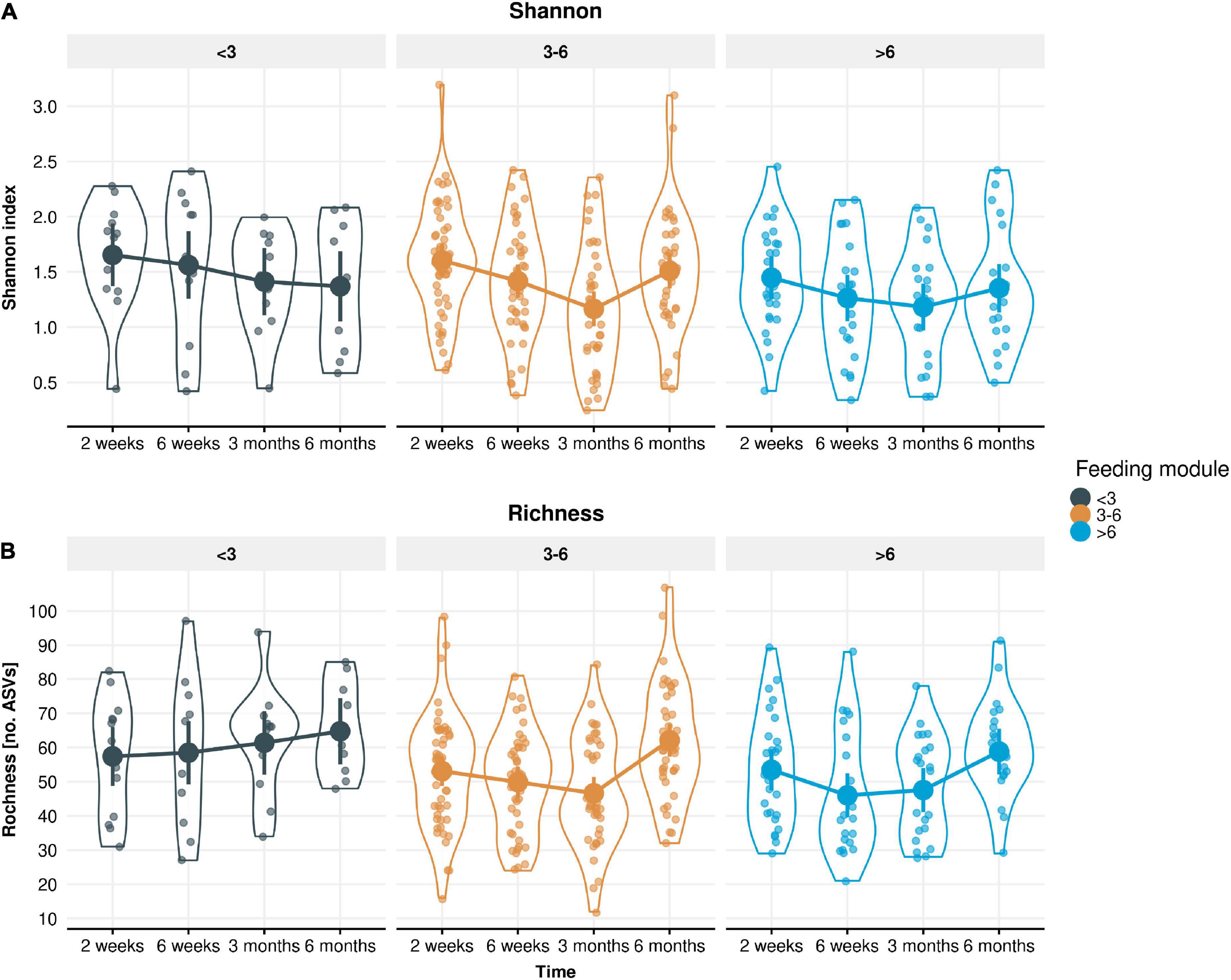 Figure 5. Measured alpha-diversity values displayed by (A) Shannon index and (B) Richness. LMM group estimates with 95% confidence intervals across the four time points (infant age 2 weeks, 6 weeks, 3 months, 6 months) stratified by the three feeding modules (breastfeeding duration < 3, 3–6, > 6 months). Richness was significantly lower in longer breastfed infant groups (p = 0.01 in the 6 weeks to 3 months period and p = 0.058 in the 3–6 months period).