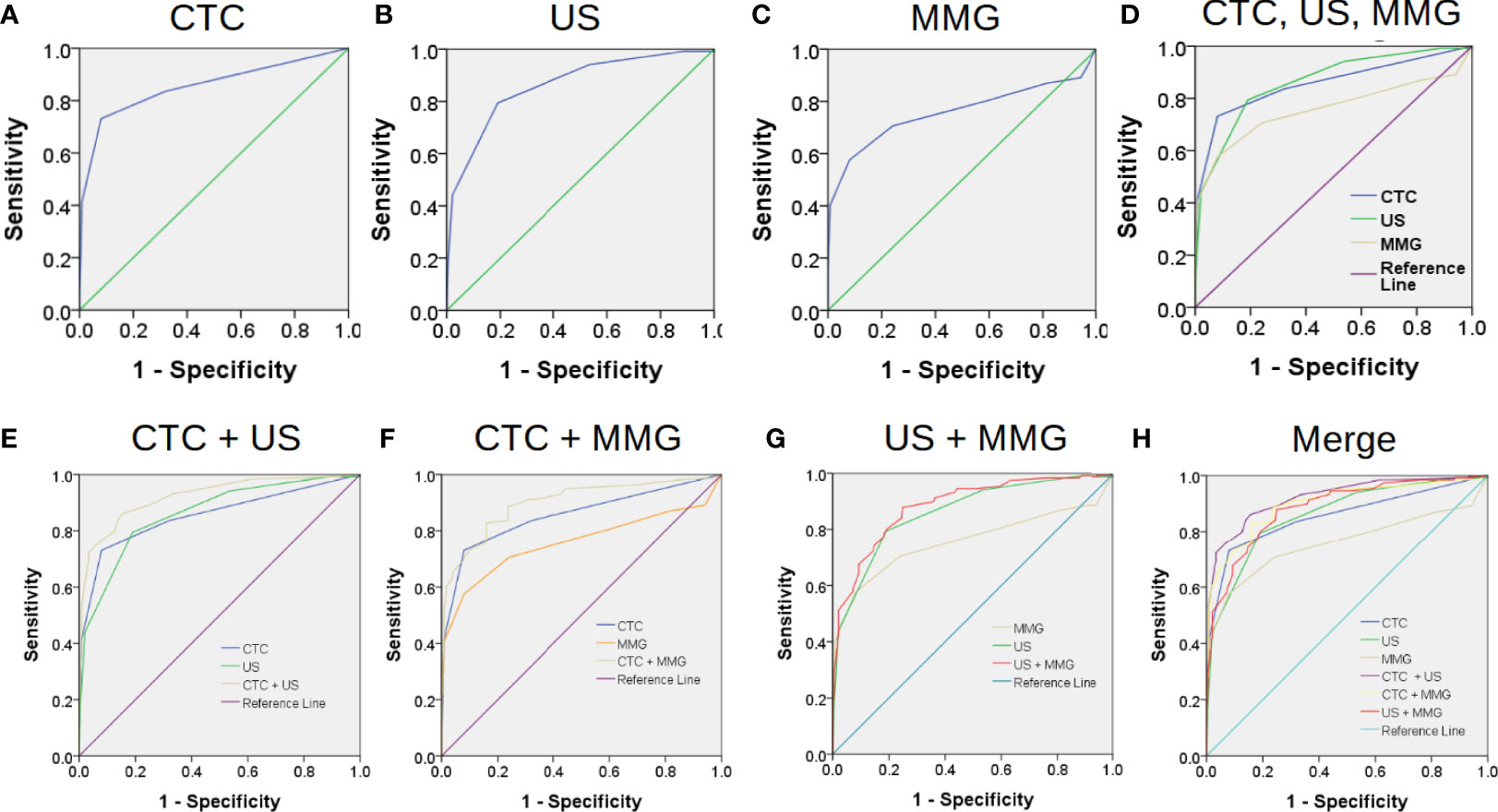 Figure 2 Combination of conventional medical imaging examinations with CTC enhances the diagnostic efficiency for BC. The performances of CTC, US and MMG in BC diagnosis are shown in (A–C) by the receiver operating characteristic (ROC) curves. Area under the curve (AUC) of CTC, US and MMG are 0.855, 0.861 and 0.759, respectively. CTC exhibits a similar diagnostic performance as US as shown in (D). Combination of CTC enhances the performances of US and MMG in BC diagnosis as shown in (E, F) with AUC increasing from 0.855 to 0.922 and 0.759 to 0.899, respectively. However, combination of MMG with US does not improve the diagnostic performance of US much as shown in (F) with AUC increasing slightly from 0.855 to 0.884. “CTC + US” gives the best diagnostic performance, while “CTC + MMG” and “US + MMG” have similar improved diagnostic performances as shown in (H).
