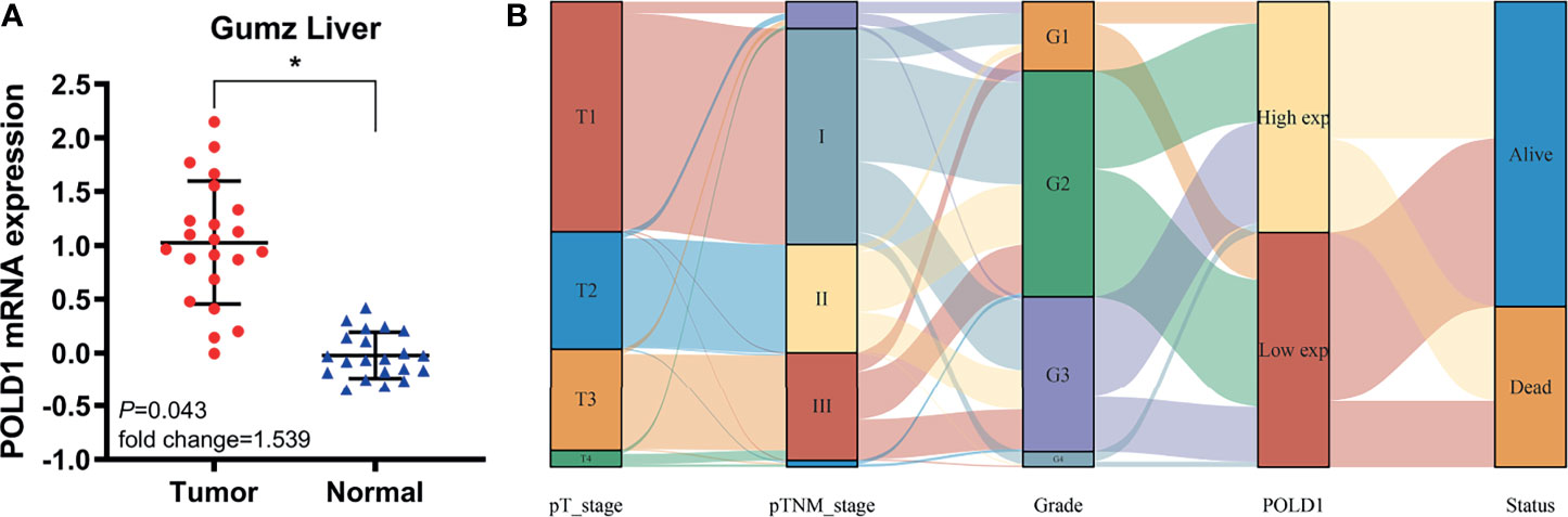Figure 4 POLD1 predicts aggressive clinic-pathologic parameters in HCC patients. (A) Significantly elevated POLD1 expression level was observed in HCC samples compared with normal samples in the Gumz Liver cohort (n = 22; P = 0.043). *p < 0.05. (B) The Sankey diagram shows the relationship between tumor grades, stages, POLD1 expression level and survival. Low tumor grade and early stage HCC patients tended to have lower expression of POLD1, while high tumor grade and advanced stage were related to the high expression of POLD1.