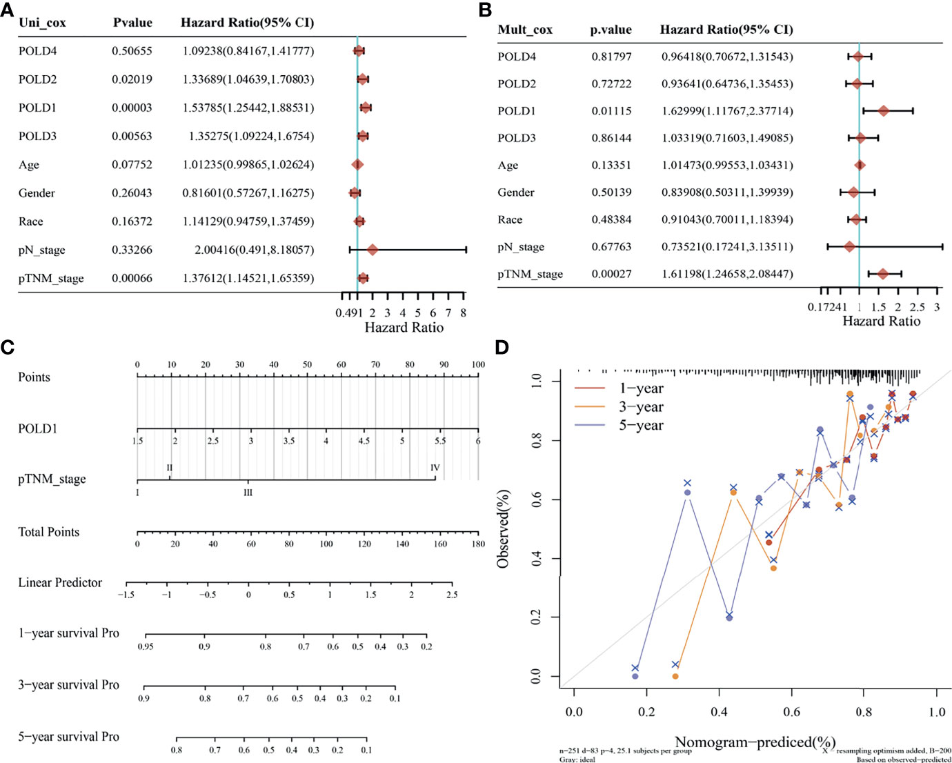 Supplementary Figure 3 | Prediction model based on Cox regression and nomogram analysis of POLD1. (A) Univariate Cox regression analysis suggested that POLD1, age, grade, race and pTNM stage were closely related to the survival of HCC patients (P < 0.05). (B) Multivariate Cox regression revealed the significant effect of POLD1 expression and pTNM stage on the prognosis of HCC. (C) We used a nomogram to evaluate the prognosis of HCC with a prediction model of POLD1 expression and pTNM stage. (D) A graphical representation of the factors was provided by nomogram to calculate the risk of recurrence for an individual patient. The prediction is more accurate in short-term survival prediction.