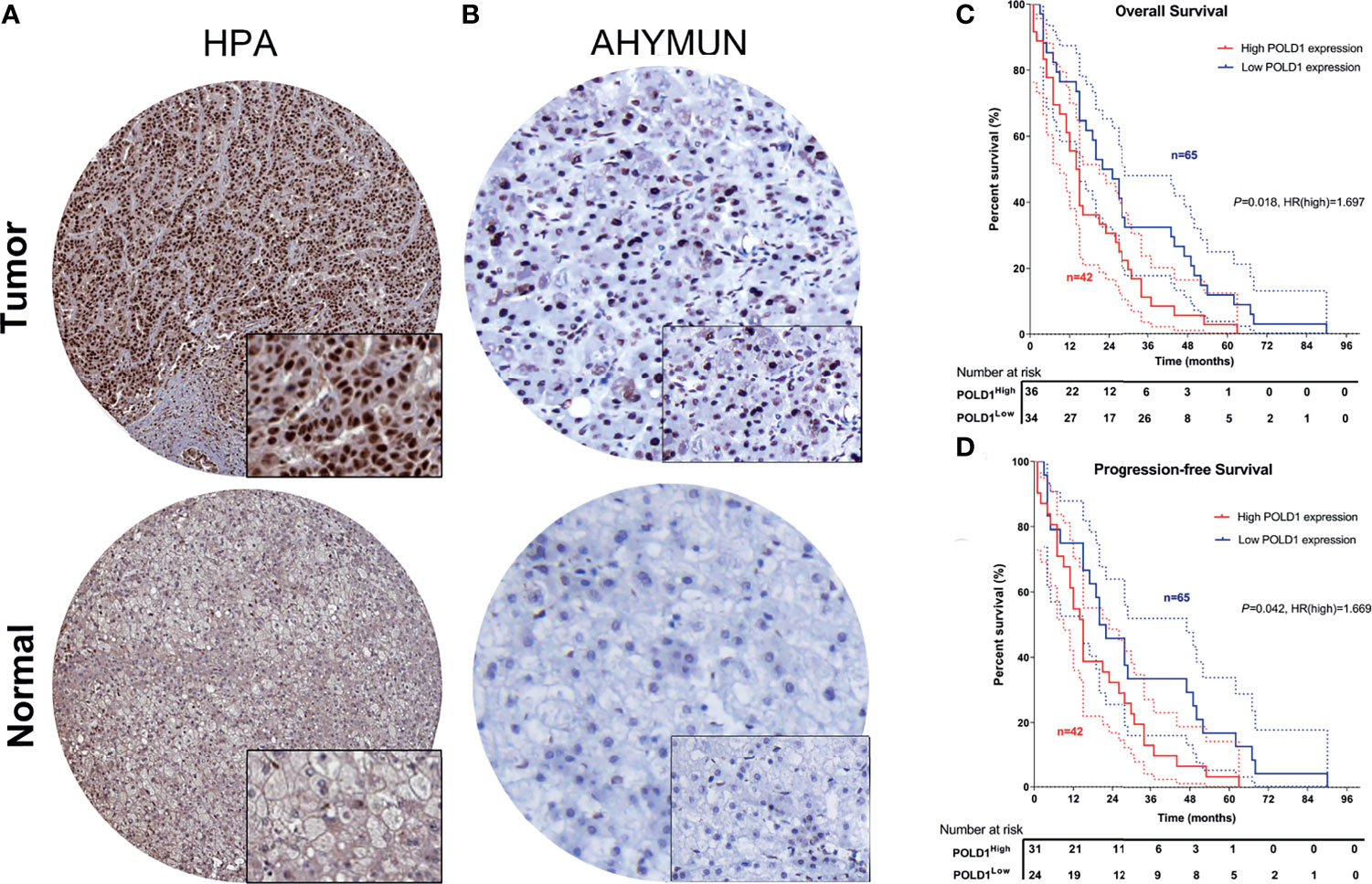 Figure 9 Validation of differential POLD1 expression and its prognostic value in the AHYMUN cohort. (A, B) IHC analysis of samples from the AHYMUN cohort showed that the expression of the POLD1 protein was significantly higher in HCC than in normal liver tissues. (C, D) Prognostic implications of POLD1 expression in 107 HCC patients from the AHYMUN cohort indicated that a high POLD1 protein level was significantly associated with worse OS (P = 0.018, HR = 1.697) and PFS (P = 0.042, HR = 1.669).
