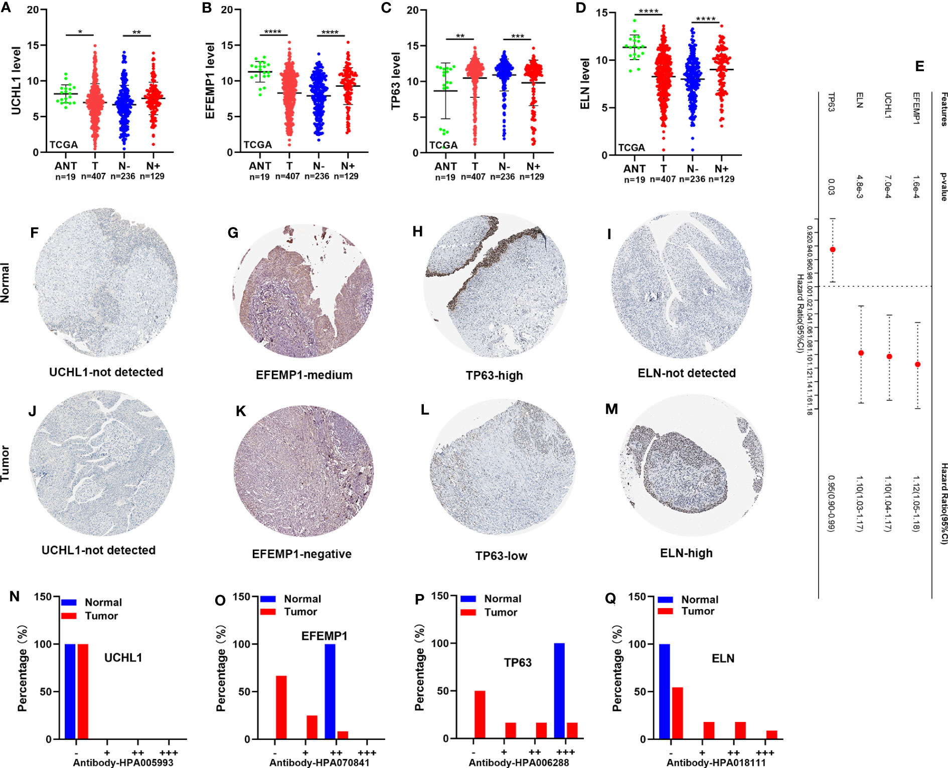 Figure 10 The expression level of TP63, ELN, EFEMP1, and UCHL1, and survival analysis. (A-D) The RNA expression of UCHL1, EFEMP1, TP63, and ELN in the TCGA cohort. (E) OS of BCa patients determined via univariate Cox regression analysis in TCGA. (F-M) IHC staining of UCHL1, EFEMP1, TP63, and ELN in normal tissues (up) and BCa tissues (down) in HPA. (N-Q) The proportion of BCa tissues with negative (−), weak (+), moderate (++), and strong (+++) staining intensity of UCHL1, EFEMP1, TP63, and ELN. HPA, the human protein atlas. *P < 0.05; **P < 0.01; ***P < 0.001; ****P < 0.0001.