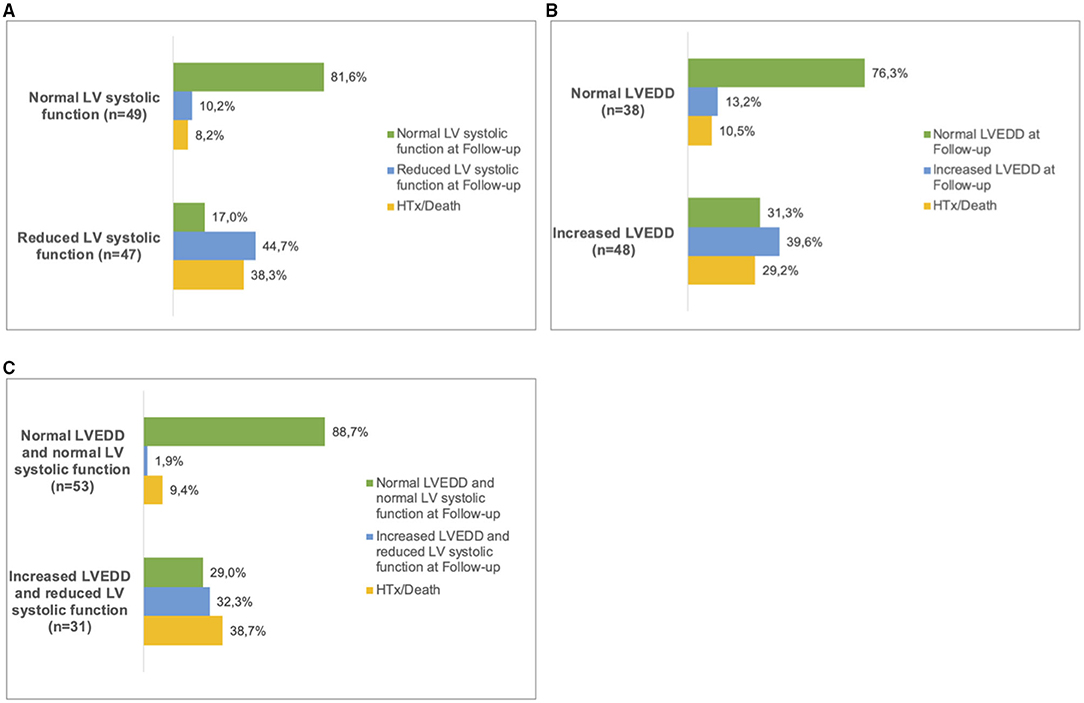 Figure 3. Follow up in LVNC patients. Patients were sorted into subgroups according to their phenotype at first presentation. (A), normal LV systolic function and reduced LV systolic function. (B), normal LVEDD and increased LVEDD and (C), 'normal LVEDD and normal LV systolic function' and ‘increased LVEDD and reduced LV systolic function'. At the last available follow-up, the respective phenotypes were recorded. In some of the patients, heart transplantation (HTx) or death had occurred. LV, left ventricular; LVEDD, Left ventricular end-diastolic diameter.