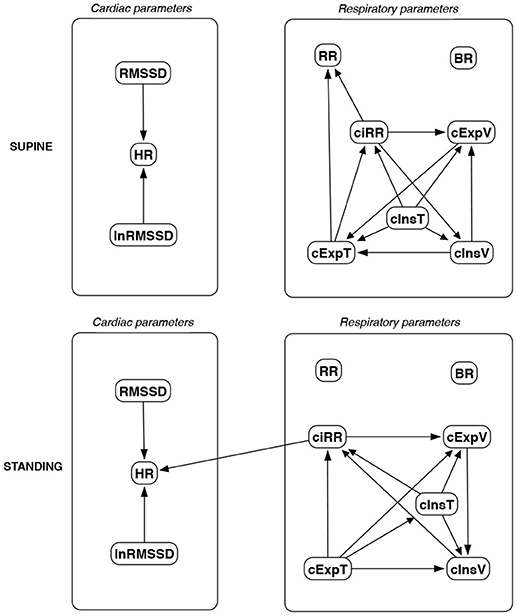 Figure 13. Causal paths discovered for supine and standing body positions using fast greedy equivalence search (FGES); relationships between RMSSD and lnRMSSD, and between BR and its input coefficients, are ignored.