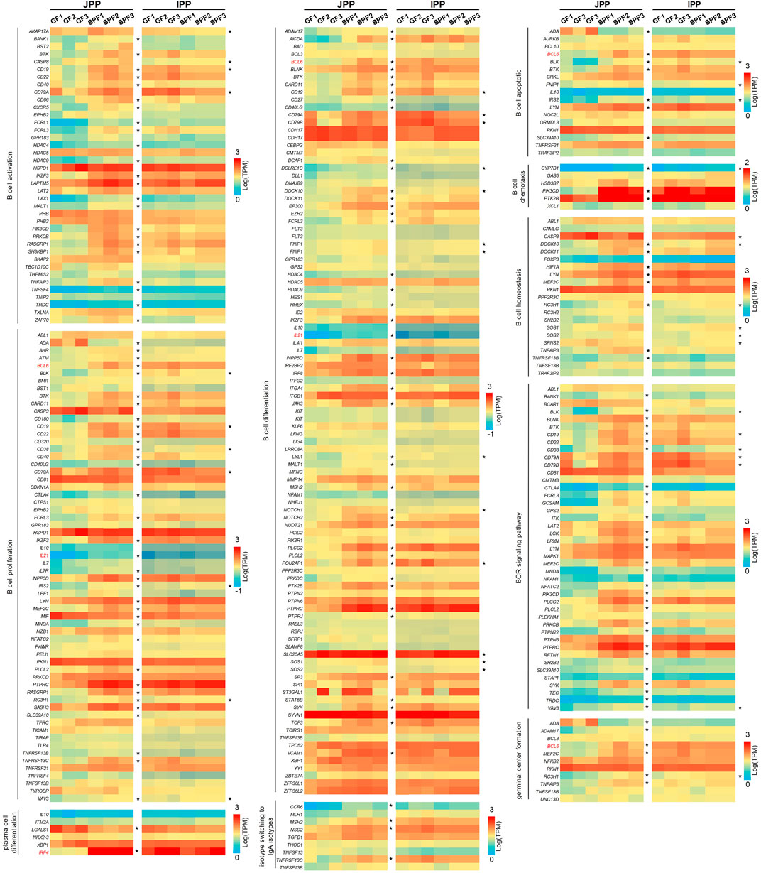 GC B cells in PPs are the main source of IgA production after antigen stimulation. The function of B cells is complex and related to many biological processes (Brandtzaeg, 2002). To study whether B cell functions are affected by the commensal microbiota, we compiled B cell function-related gene sets dividing genes by 10 biological processes: B cell activation, B cell proliferation, B cell differentiation, B cell apoptosis, germinal center formation, plasma cell differentiation, B cell chemotaxis, B cell homeostasis, BCR signaling pathways, and isotype switching to IgA isotypes. As shown in Figure 5, the commensal microbiota induced the expression of most B cell function–related genes in JPPs; the expression of 160 genes (50.80% of the total genes) was significantly upregulated. In contrast, the trend of expression profiles was weaker in IPPs (41 genes, accounting for 13.20% of the total) (Supplementary Table S4). These results indicate that the commensal microbiota affects intestinal mucosal immunity by modulating the expression of B cell function–related genes to different degrees.