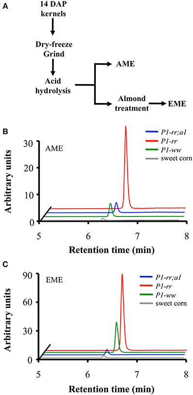 Figure 5. Apigenin content in whole-food maize formulations. (A) Work flow of whole-maize kernel food extract preparation, AME: acid whole maize extract and EME: enzymatically treated whole maize extract. Chromatograms corresponding to apigenin content from P1-rr (red); P1-rr;a1 (blue); P1-ww (green) and sweet corn (gray) in AMEs (B) and EMEs (C). Arbitrary units correspond to peak intensity for the 268.9/117.0 transitions in counts per second.