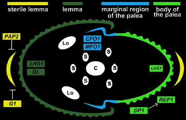 Figure 2. Major transcription factors controlling the development of the lemma and palea in rice. Genes involved in development of lemma and palea are shown. lemma (dark green); marginal region of palea (mrp; blue); body of palea (bop; light green); sterile lemma (yellow); Lo, lodicule; S, stamen; C, carpel.