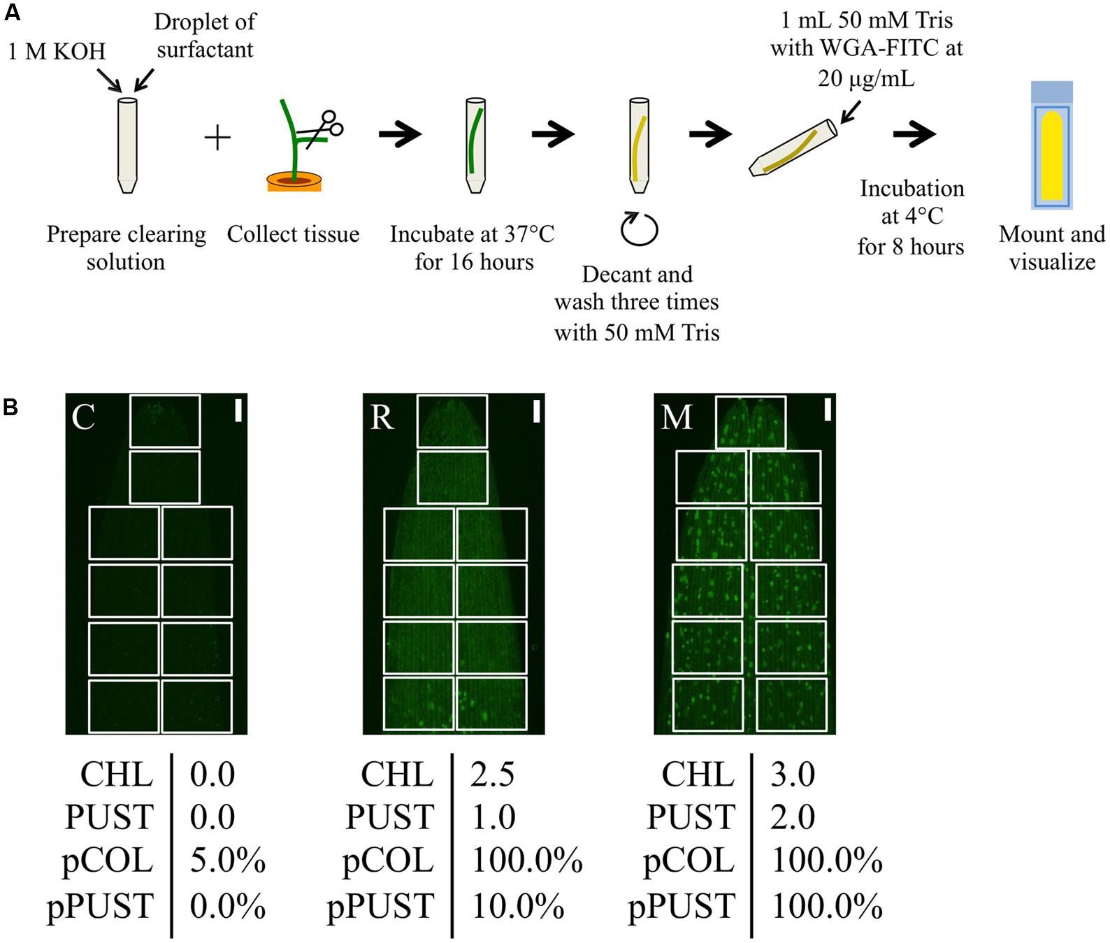 FIGURE 2. Quantitative microscopic phenotyping of P. striiformis colonization and pustule formation using pCOL and pPUST on barley. (A) A modified WGA-FITC staining protocol based on the procedure proposed by Ayliffe et al. (2011, 2013). (B) Representative samples with macroscopic phenotypes for chlorosis (CHL) and pustule formation (PUST) were microscopically analyzed using pCOL and pPUST based on stereo micrographs of the first leaf. The microscopic assays were developed for quick evaluation through evaluating disjoint fields of view (FOV; white boxes) covering the surface area of the leaf by scanning a mounted leaf segment along either side of the longitudinal axis for barley or centered on the longitudinal axis for B. distachyon. For pCOL, an estimate is generated within each FOV based on a convex hull defined by P. striiformis hyphal growth to be less than 15%, between 15 and 50%, or greater than 50% of the FOV area and given scores of 0, 0.5, or 1, respectively. A convex hull is defined as the minimal area that contains the full extent of colonization of P. striiformis within a FOV. Disjoint convex hulls may occur within the same FOV and are used to collectively estimate the percent colonization in each FOV. Each score was recorded, with the final score determined by averaging these scores based on the total number of FOVs evaluated and ranged from 0 to 100%. pPUST was evaluated in a similar manner, although convex hulls were defined by the clustering pattern of P. striiformis pustules. From left to right, accessions CIho 4196 (C), Russell (R), and Manchuria (M). The scale bar is 1 mm.