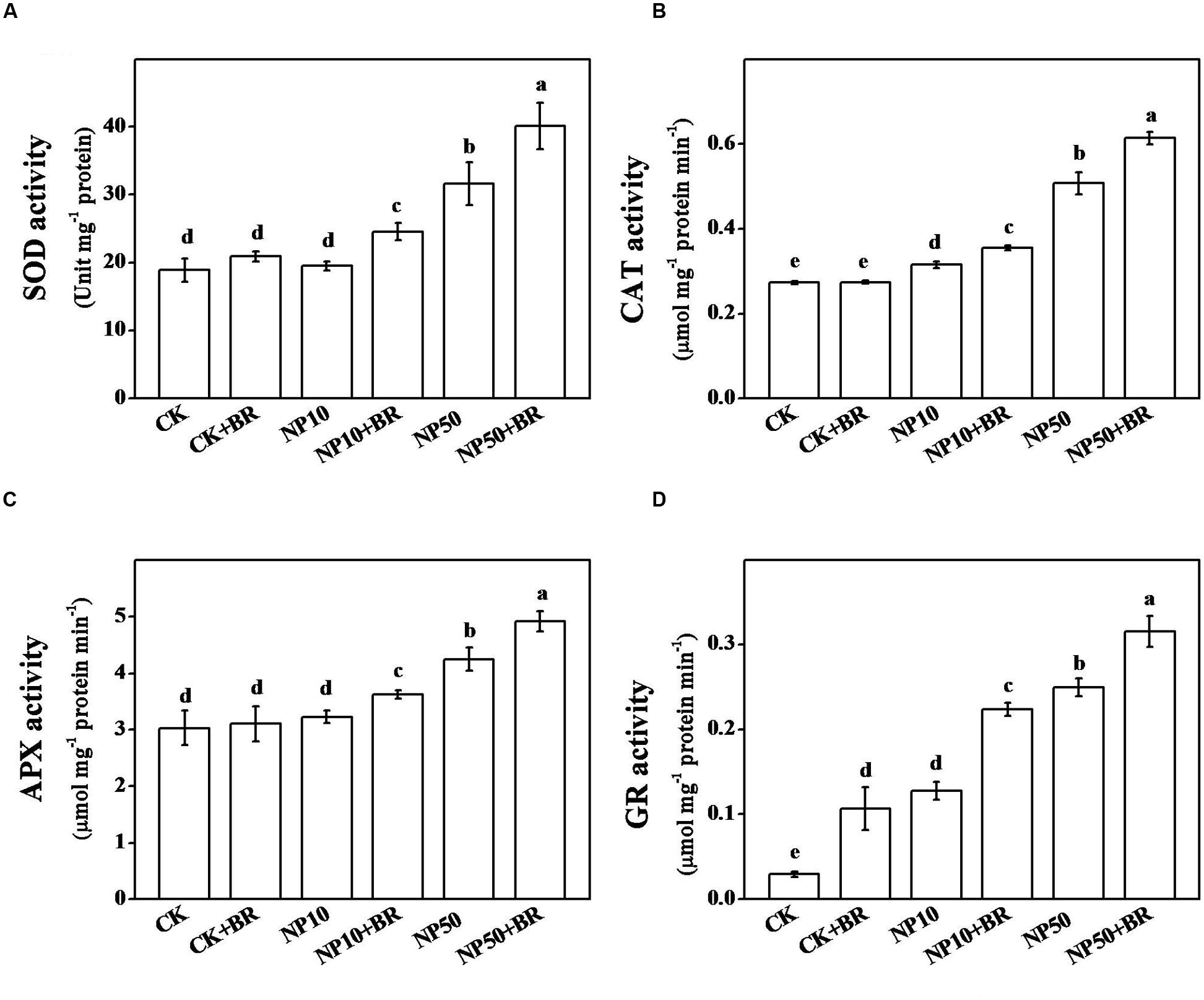 Responses of antioxidant enzymes to individual and combined treatment of BR and ZnO NPs have been shown in Figure 4. Among four analyzed antioxidant enzymes such as SOD, CAT, APX, and GR, 10 mg/L ZnO NPs increased activities of CAT and GR only, while 50 mg/L ZnO NPs significantly induced activities of all four enzymes. For instance, activities of SOD, CAT, APX, and GR increased by 67.4, 85.8, 40.3, and 747.1% following exposure of seedling to 50 mg/L ZnO NPs for 15 days. Although BR treatment alone increased activity of GR only, combined treatment of BR and ZnO NPs remarkably increased activities of all four enzymes, compared with that of ZnO NPs (low and high) only treatments. These observations further confirm that alleviation of ZnO NPs-induced oxidative stress, is closely associated with enhancement of antioxidant enzyme activity by BR.