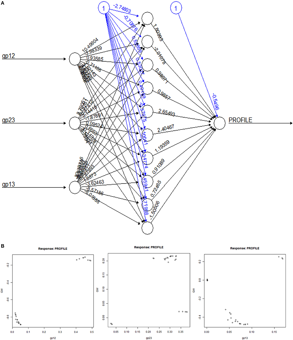 Figure 5. Details of the predictor-ANN. (A) The ANN-predicted subclass assignment is dependent on the computed weights and the intercept function. The feedback mechanism for this network is back propagation. (B) Plots of αij-scores (gp12, gp23, gp13) the associated weights.
