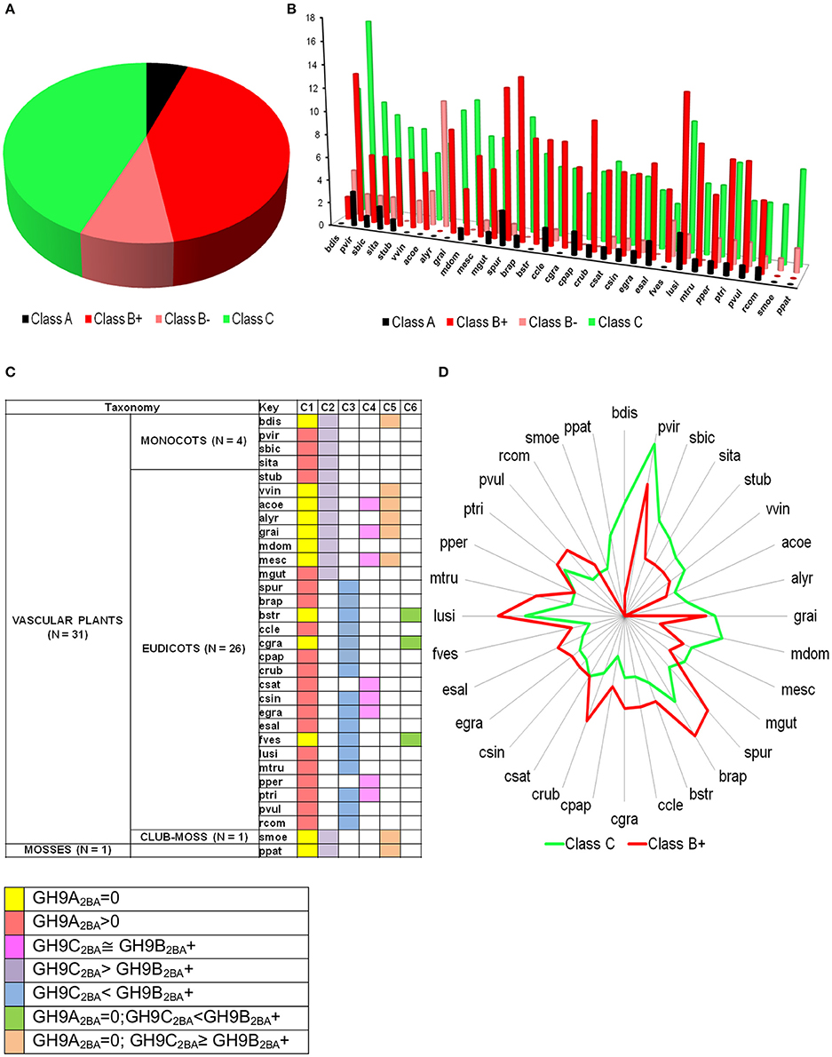 Figure 6. Prediction profile of GH9 endoglucanases in test dataset (GH9X2BA = 552). (A) Generic distribution of sub-class members in the primary proteomes of 32 green plants with sequenced genomes. Here, class B+ refers to sequences with high-confidence in their assignment, in contrast with class B− data. (B) Taxonomic spread of classes A, B, and C in selected phytozome data, (C) Association table of class specific GH9 proteins, and (D) Radar plot of the distribution of members of classes-B+ and C.