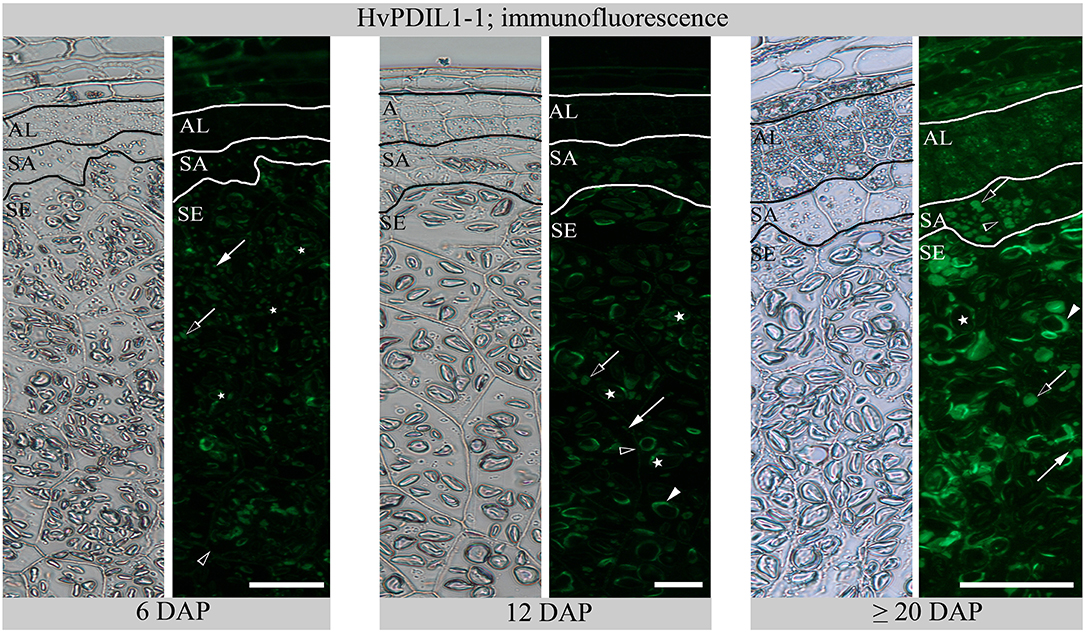 Figure 7. Immunofluorescence of HvPDIL1-1 with anti-AtPDIL1-1 at 6, 12, and ≥20 DAP. Aleurone (AL), subaleurone (SA), starchy endosperm (SE). Arrows indicate PBs with a smaller diameter, open arrows indicate PBs with a larger diameter and arrowheads the specific signal from the protein matrix at the periphery of the starch granules (asterisks). See the labeling of the plasma membrane in starchy endosperm (SE) at 12 DAP and in aleurone (AL) and subaleurone (SA) at ≥20 DAP (open arrowheads). Note the weak signal in aleurone (AL) at ≥20 DAP. Scale bar = 50 μm.