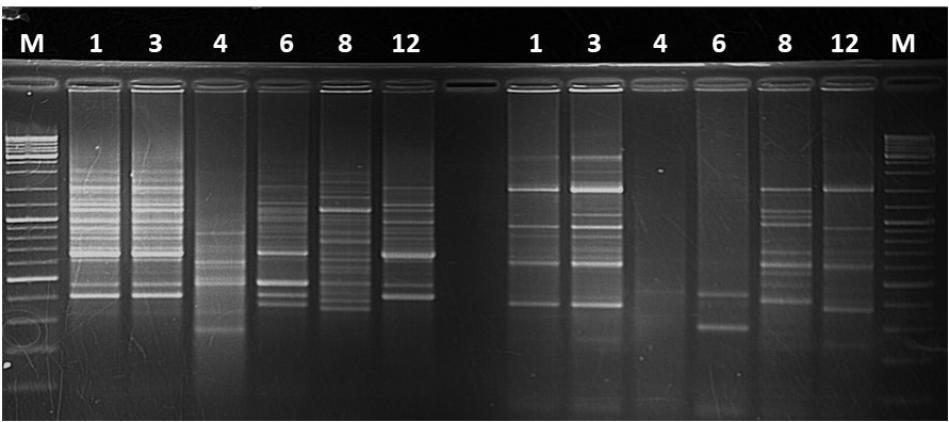 FIGURE 7. DNA finger prints on agarose gel for different Xanthomonas campestris pv. musacearum (Xcm)-like isolates from: 1, Canna sp.; 3 and 8, banana; 4, sugarcane; 6, Taro; and 12, Xcm positive control. The initial Xcm isolate was obtained from a symptomatic banana plant at Kawanda research station, central Uganda. Isolates 1, 3, and 8 caused disease in banana plantlets while 4 and 6 did not.