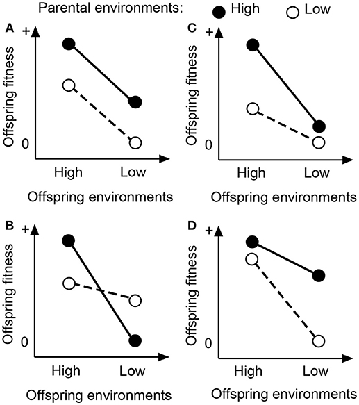 Figure 1. Schematic diagram for parental environmental effects that are not related to offspring environments (A), or that are related to offspring environments (B–D). See the text for details.