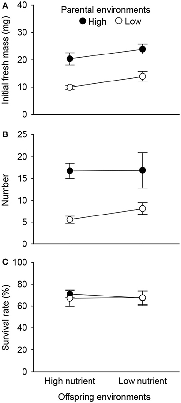 Figure 5. Effects of parent and offspring (1st generation) nutrient treatments on initial fresh mass (A) and number (B) of the surviving 1st generation offspring ramets, and survival rate (C). Means + SE are given.