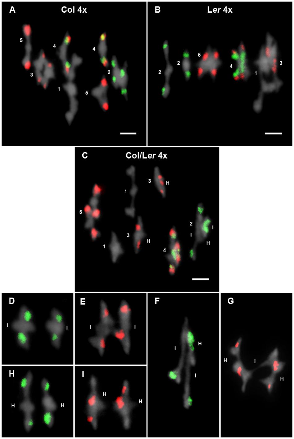 Figure 3. Cytological analysis of autotetraploid cells at metaphase I. Representative examples of metaphases I from Col 4x (A), Ler 4x (B), and Col/Ler 4x (C). Chromosomes are identified by FISH with 5S (red) and 45S rDNA (green) probes. In Col 4x, tetrasomes 1, 2, and 3 appear as quadrivalents, whereas two bivalents are formed in tetrasomes of chromosomes 4 and 5. In Ler 4x, only the tetrasome of chromosomes 2 appears as two bivalents. In the hybrid, two bivalents are formed in tetrasomes of chromosomes 1 and 3, whereas the remaining tetrasomes appear as quadrivalents. The figure also includes examples of associations between identical chromosomes in bivalents formed by chromosomes 2 (D) and chromosomes 3 (E). Examples of associations between homologous chromosomes in bivalents formed by chromosomes 2 (H) and chromosomes 3 (I). Examples of quadrivalents formed by chromosomes 2 (F) and 3 (G). Capital letters I and H represent identical and homologous association, respectively. Bars represent 5 μm.