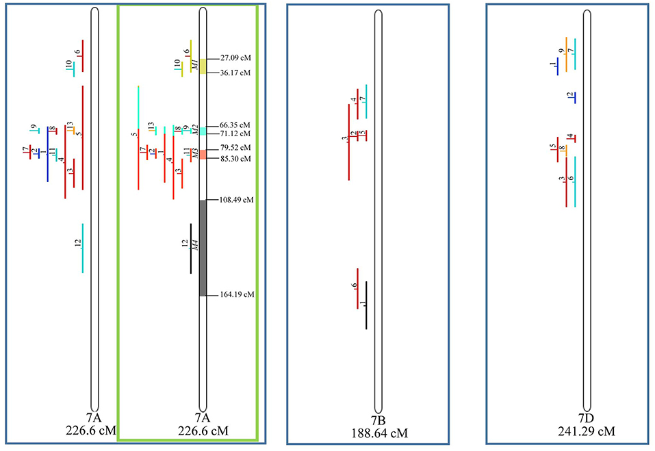 Figure 9. Projection (left) and, with green borders meta-QTL of FHB resistance in wheat for chr. 7A, and only projection for 7B and 7D. The color system follows the same as Figure 3.