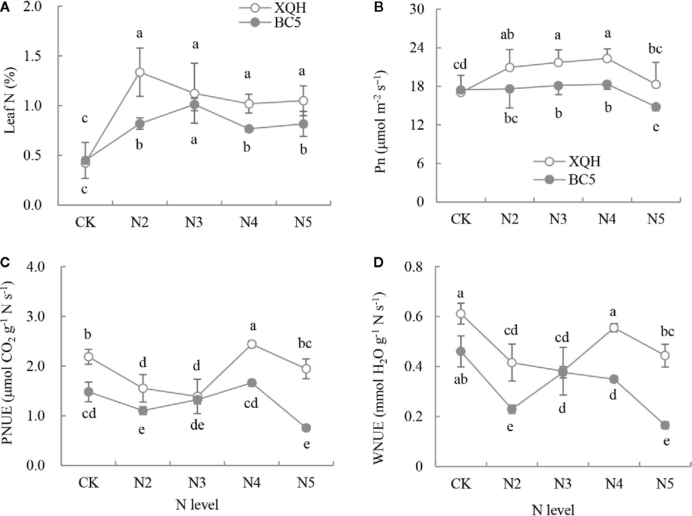 Figure 1 Leaf N concentration (%, A), net photosynthetic rate (Pn, B), photosynthetic N utilization efficiency (PNUE, C) and transpiration-water N utilization efficiency (WNUE, D) of two poplar clones (XQH and BC5) under different N-supply levels. CK: seedlings grown without N addition; N2, N3, N4, and N5: seedlings grown with 2, 3, 4, and 5 g N (in form of urea) per plant, respectively. An accumulative amount of N addition is 0 (CK), 4 g (N2), 6 g (N3), 8 g (N4), and 10 g (N5) per plant, respectively. The same lowercase letter above the error bars indicates no significant difference (p < 0.05; Duncan’s test).
