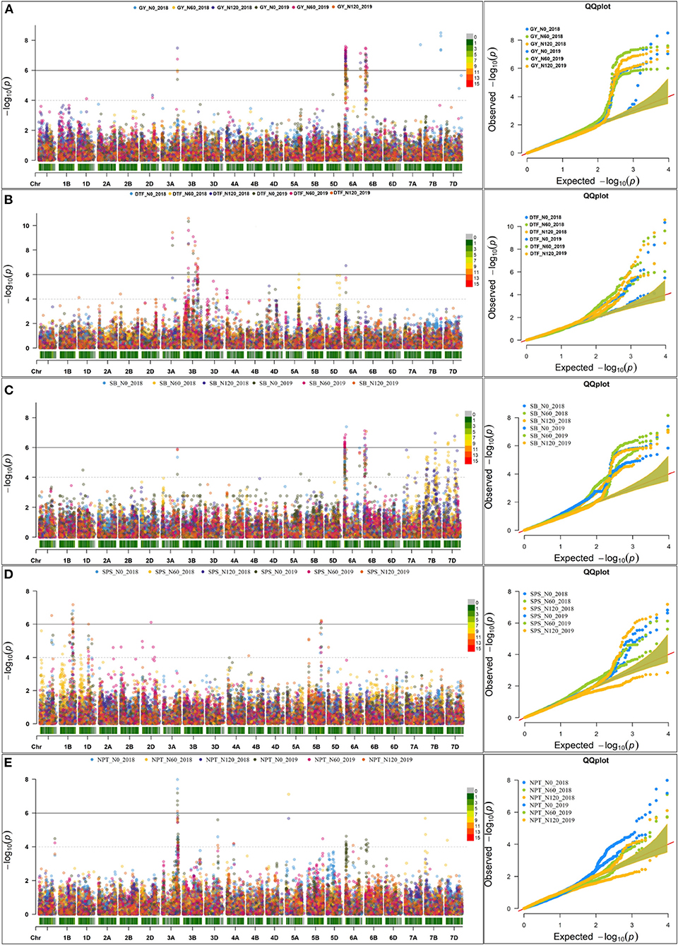 Figure 4. Manhattan plot and qq plot for the yield and yield-related traits across seasons at three different levels of nitrogen (N) (N0, N60, and N120). (A) grain yield (GY), (B) About 50% days to flowering (DTF), (C) shoot biomass (SB), (D) spikelets per spike (SPS), and (E) number of productive tillers.