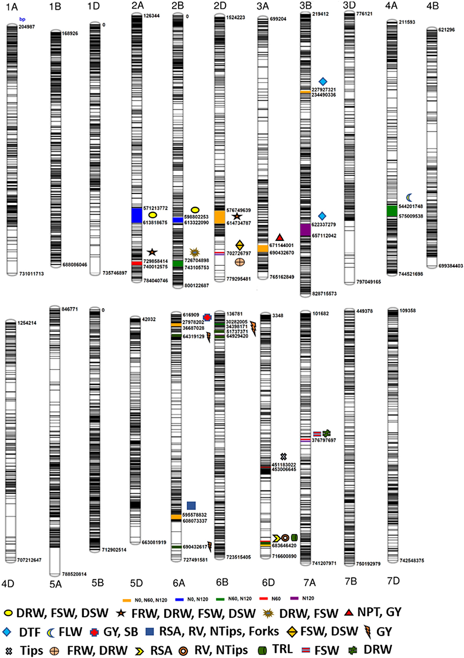 Figure 5. Schematic representation of the single nucleotide polymorphism (SNP) distribution along the 21 chromosomes of wheat. The chromosome map showing genomic regions where marker-trait associations (MTAs) for different nitrogen-use efficiency (NUE)-related trait, root traits, yield, and yield-related traits. The numbers below each chromosome indicate chromosome numbers. The bp represents the physical position of the SNPs on the chromosome in base pair.