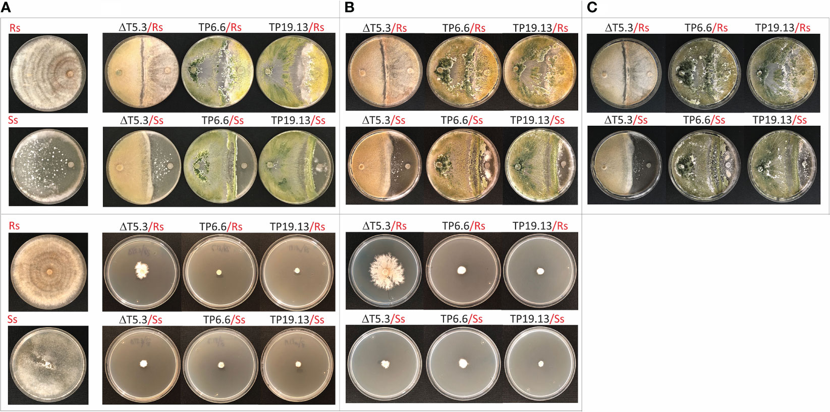 Figure 4 Upper panels. Direct confrontation assays of Trichoderma strains, Δtri5.3 (= ΔT5.3), TP6.6 and TP19.13, versus the pathogens R. solani R43 (Rs) (first row), or S. sclerotiorum S47 (Ss) (second row). Plates were incubated for one (A), two (B), or three weeks (C). Control plates with the pathogens without Trichoderma are included in the left column. In all confrontations pathogen´s plugs are located at the right and Trichoderma plugs are located at the left of the plates. Lower panels. Cellophane membrane assays to analyze the antifungal activity of the same Trichoderma strains indicated above against Rs (third row) and Ss (forth row). Plates were incubated for one (A) or two (B) weeks after placement of the pathogen plug. Control plates with the pathogens grown without Trichoderma metabolites are included at the left column. Note that control plates were incubated in the same conditions as the plates where the direct confrontation or the cellophane membrane assays were performed.