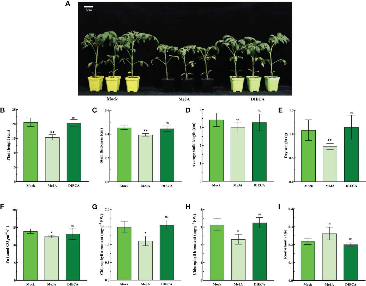 Figure 1 Effects of MeJA and DIECA on the growth and photosynthesis of tomato seedlings. (A) Phenotypic changes in 5-week-old seedlings after 1 week of treatment with 100 μM MeJA or 200 μM DIECA. (B) Plant height. (C) Stem thickness. (D) Average stalk length. (E) Dry weight. (F) Net photosynthetic rate (Pn). (G) Chlorophyll a content. (H) Chlorophyll b content. (I) Root–shoot ratio. Errors are standard deviations for three biological replicates (n=3). Differences between means were analyzed for significance using Student’s t test, *P< 0.05, **P < 0.01. ns, no significant difference.