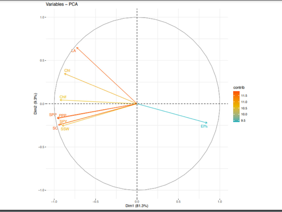 Likewise, during second year, PCA analysis (Figure 6) indicated five principal components correlating to 9 traits contributed 97.9% to the total variability. The individual contribution of each component was 81.2%, 9.3%, 3.62%, 2.51% and 1.29%. PPP (12.6) had the highest contribution to PC1. Likewise, LA (50.69) contributed with highest positive value to PC2. EL% (57.38), ChlF (40.18) and Chl (53.1) had highest positive contribution to PC3, PC4 and PC5, respectively.