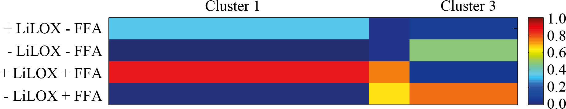 Figure 3 Ex vivo assay of LiLOX. After extraction of the total metabolites from L. incisa, the mixture was solubilized in bis-tris propane buffer pH 7.5, and split in four samples named A, B, C and D. Purified LiLOX was added to the samples A and C. Pure free PUFAs (FFA) were added to samples C and D as internal standards. All samples were analyzed following a non-targeted method, by LC-MS, and the data were analyzed by automatic clustering using the software MarVis. The figure represents the One-dimensional Self-Organizing Map (1D-SOM) revealing putative substrates and putative products with and without LiLOX reaction. The heat map colors represent average intensity values according to the color map on the right-hand side. The width of each cluster is proportional to the number of features assigned to this cluster.