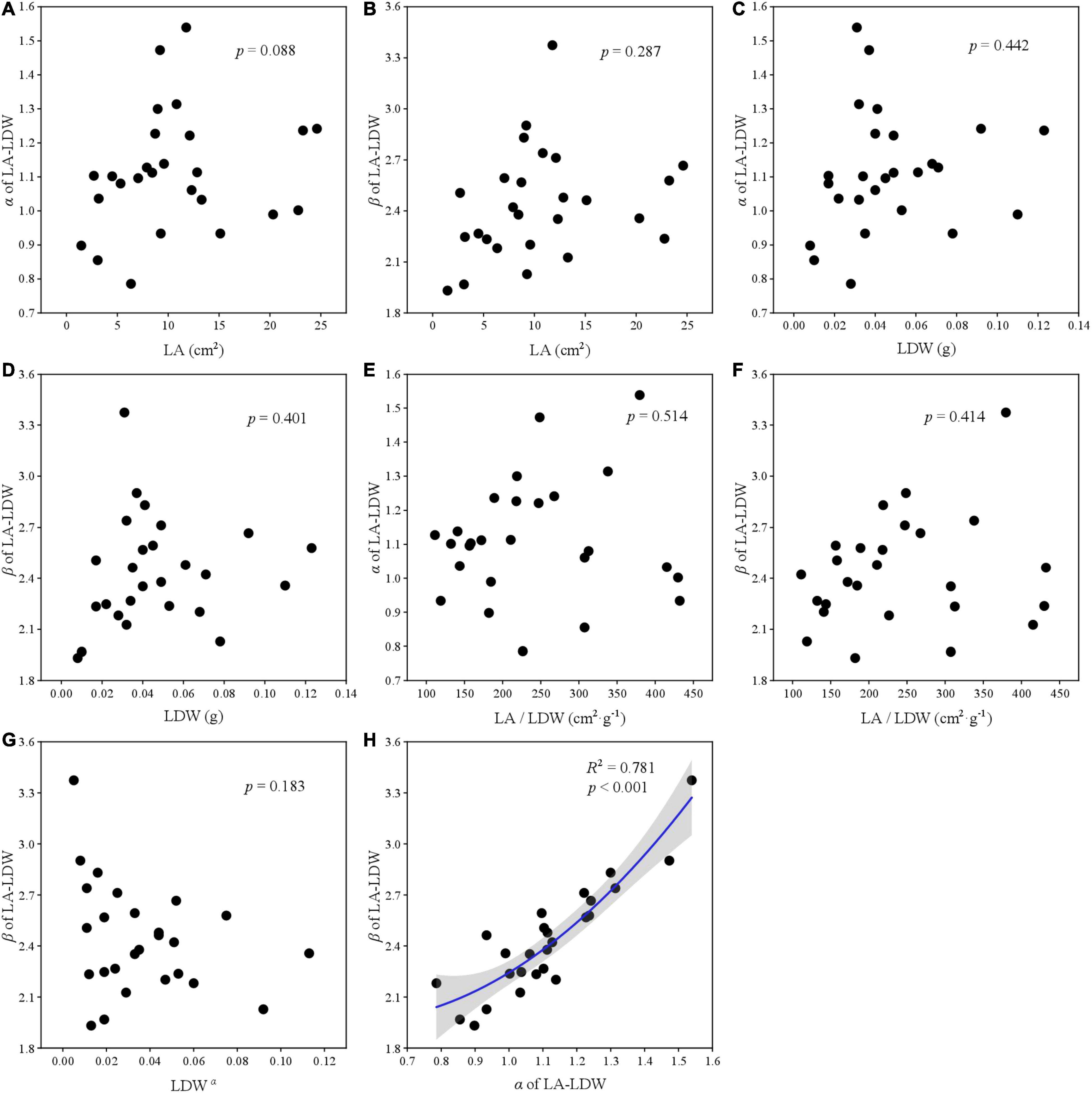 The relationships among two scaling parameters (i.e., α and β) and other derived parameters were very complex (Figures 57). Overall, only the α and β of the three paired traits had a significant quadratic relationship (all p < 0.001) (Figures 5H, 6H, 7H), other traits and scaling parameters had no clear linear relationship (Figures 5A–G, 6A–G, 7B–G). Even so, we still detected a weakly relationship between α of LA-LDW with LA (R2 = 0.351, p = 0.088) (Figure 7A).