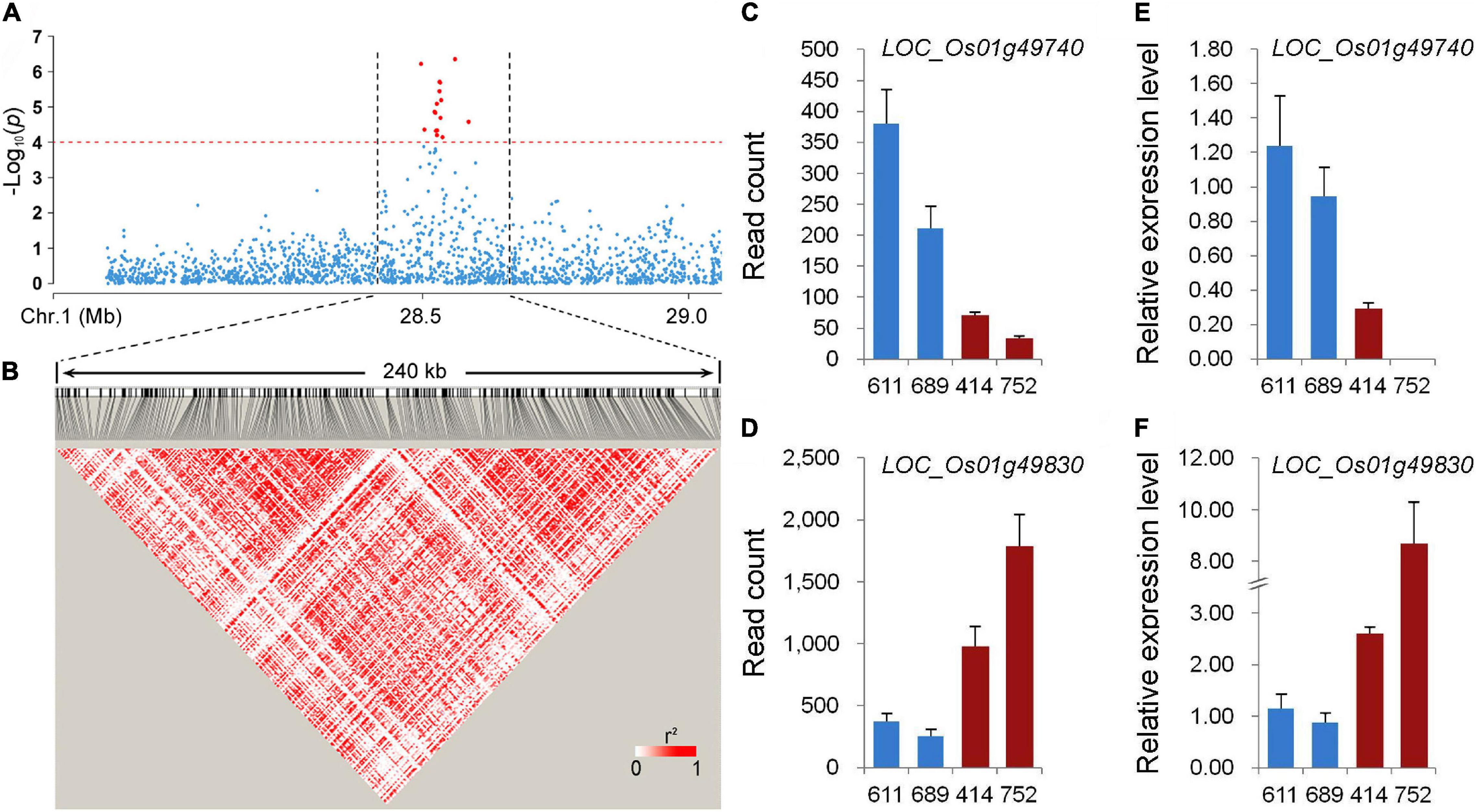 Figure 3. Candidate gene analysis of qPC-1. (A) Local Manhattan plot of GWAS for qPC-1. (B) Linkage disequilibrium (LD) heatmap around the peak. (C,E) The expression of LOC_Os01g49740 in lines with white pericarp (accessions 611 and 689) and red pericarp (accessions 414 and 752) measured using RNA-seq and qRT-PCR, respectively. (D,F) The expression of LOC_Os01g49830 in lines with white and red pericarp measured using RNA-seq and qRT-PCR, respectively.