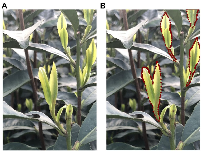 Figure 2. Instance segmentation example of tea shoots dataset (A) original image, (B) the visualization of the boundary points for the mask.