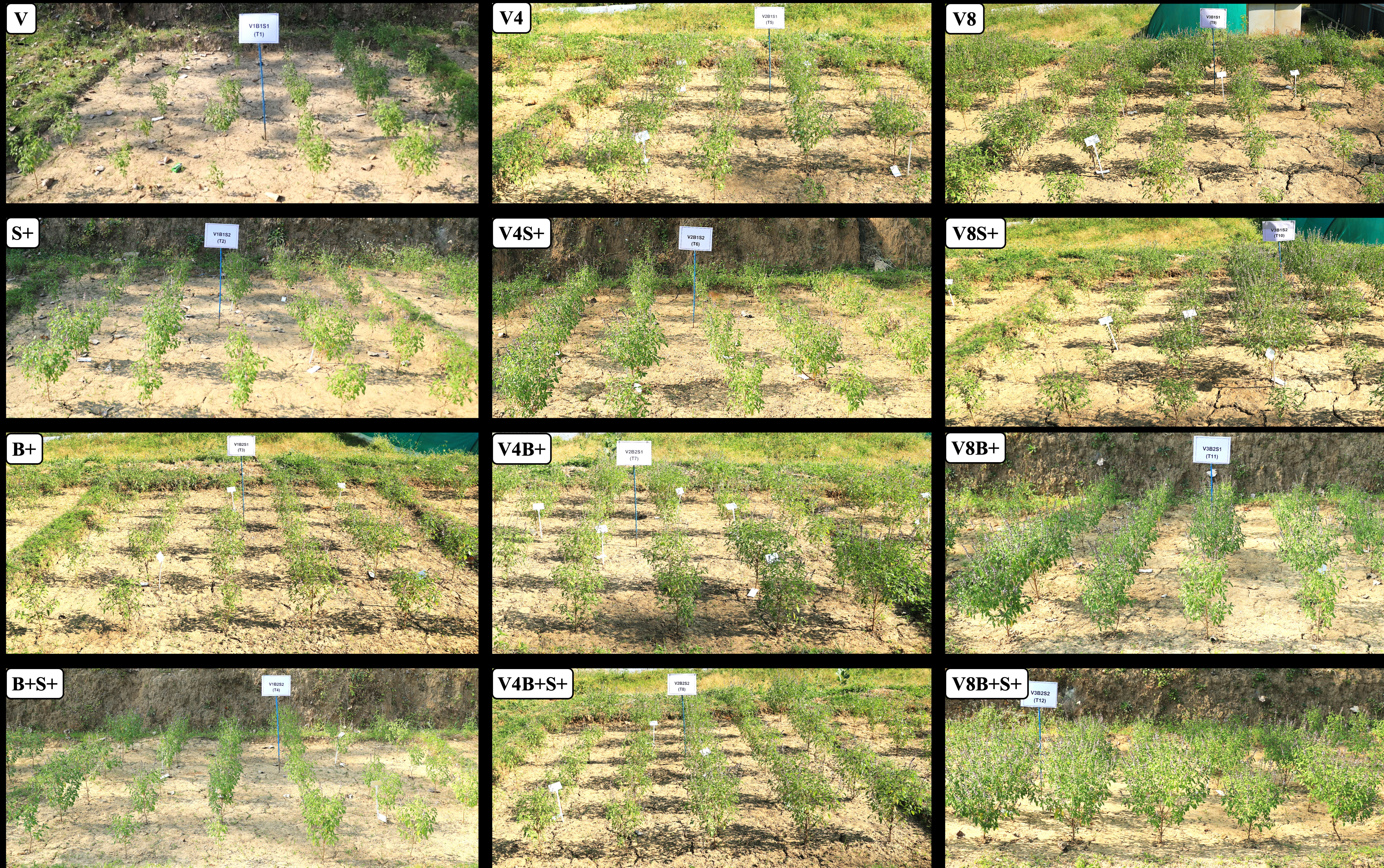 Figure 7 Treatment-wise representative experimental plots of O. basilicum in the Indian western Himalaya. V, vermicompost; V−: unfertilized control (no added manure); V4, vermicompost at 4 Mg ha−1; V8, vermicompost at 8 Mg ha−1; B, biofertilizer; S, seaweed extract; (−), without factor; (+), with factor. Other abbreviations are provided in Table 1.